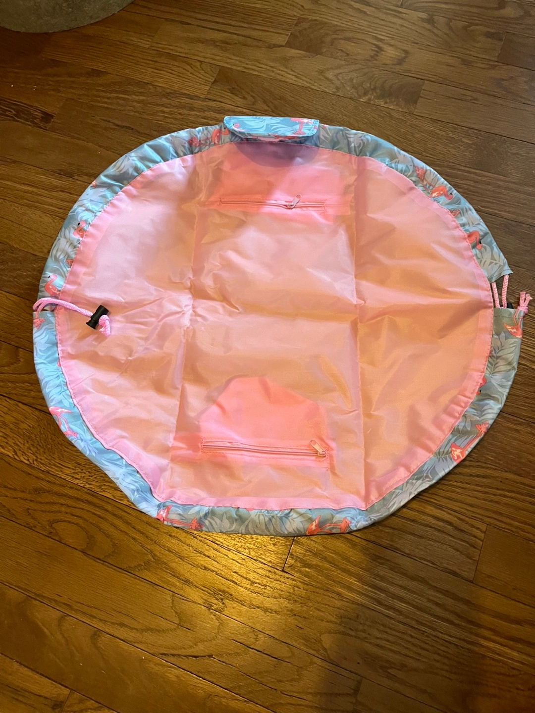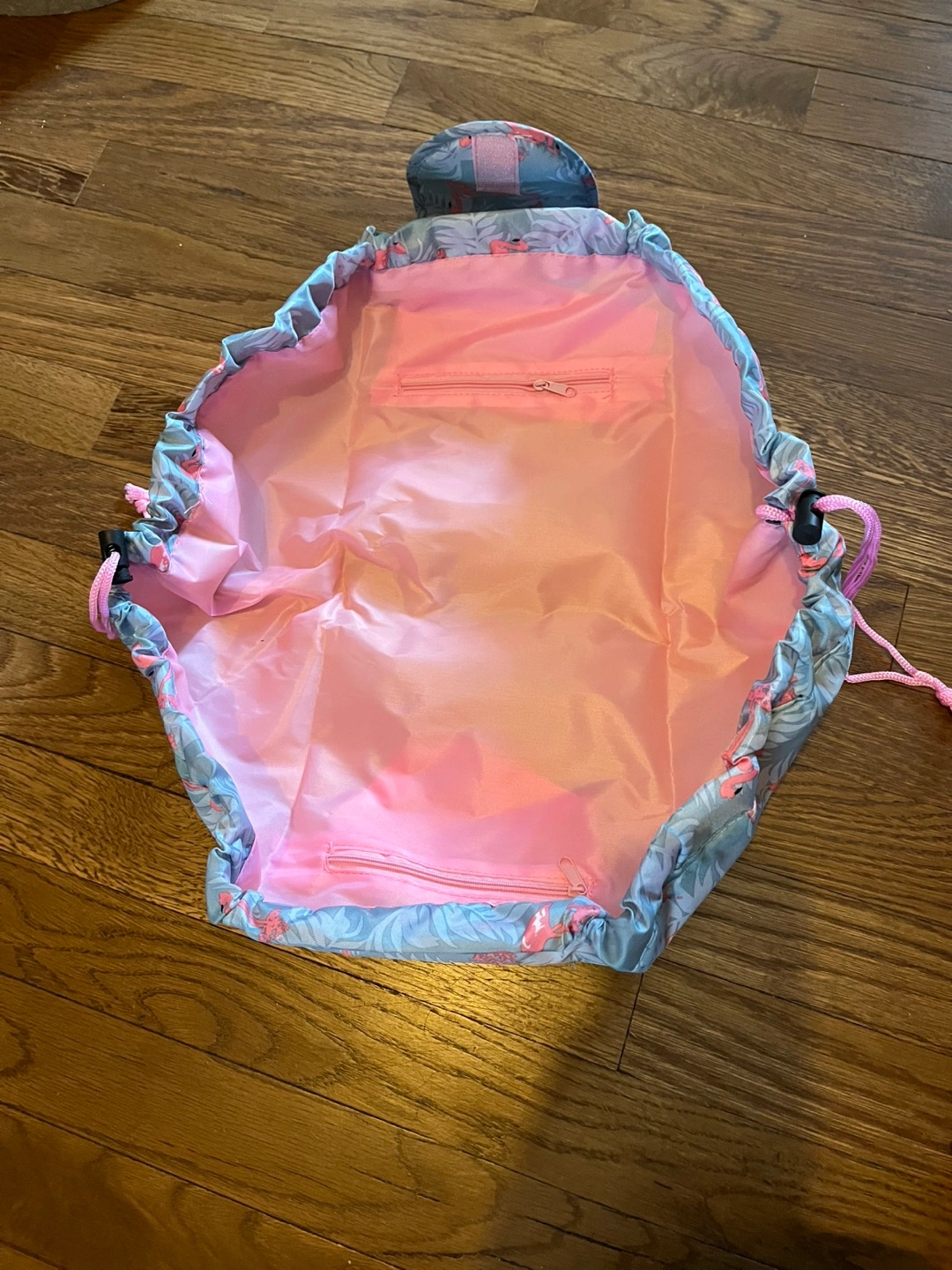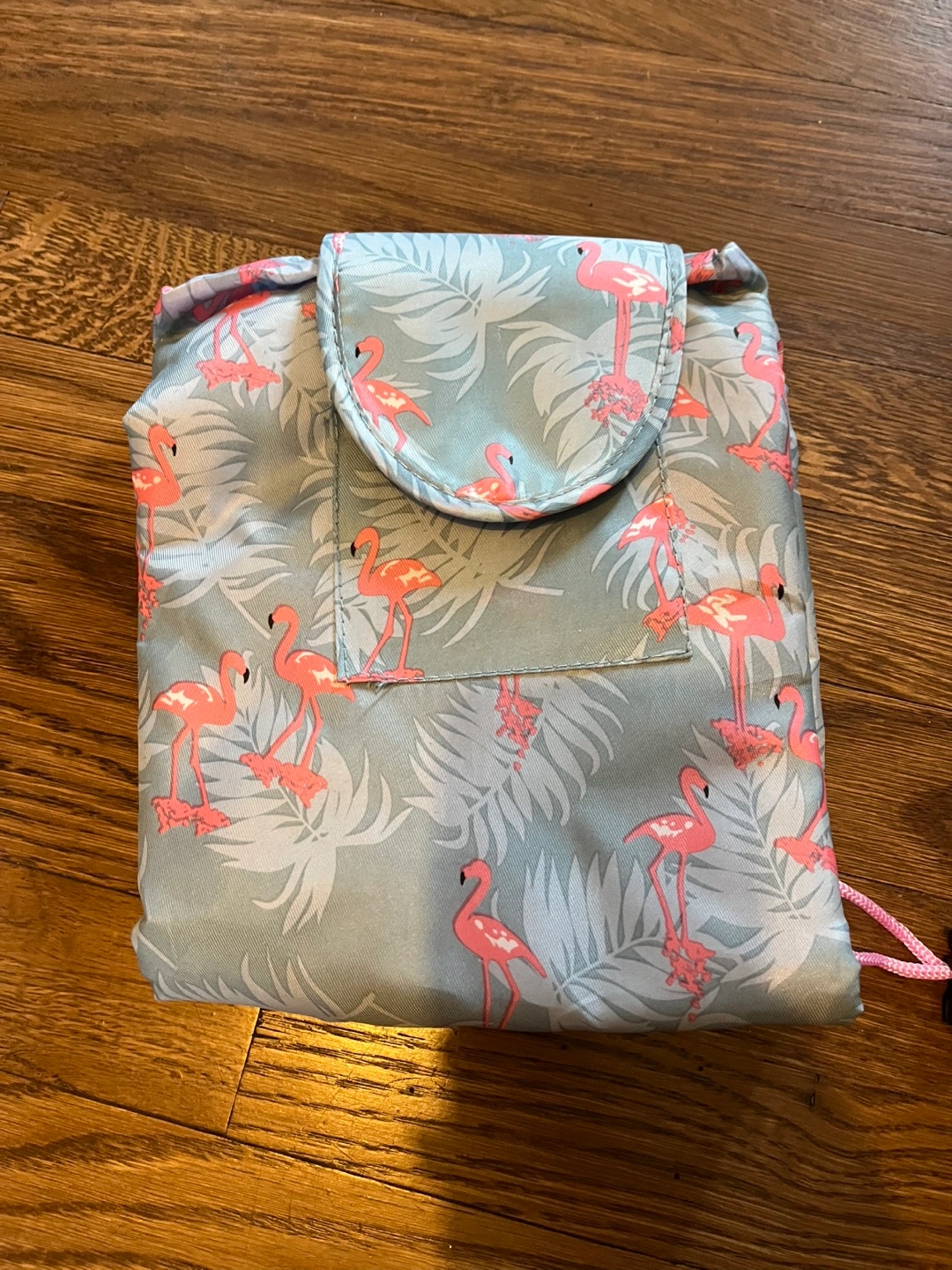 147Pink and gray drawstring cosmetic bag. Features a flamingo print and interior pockets. Great for travel.