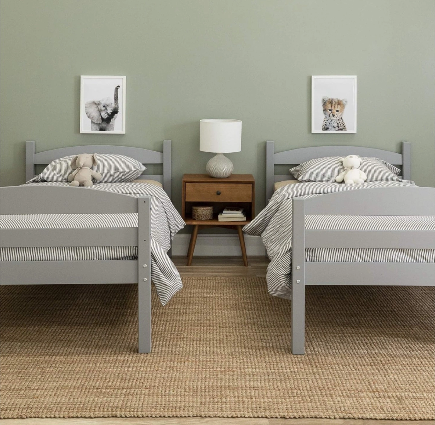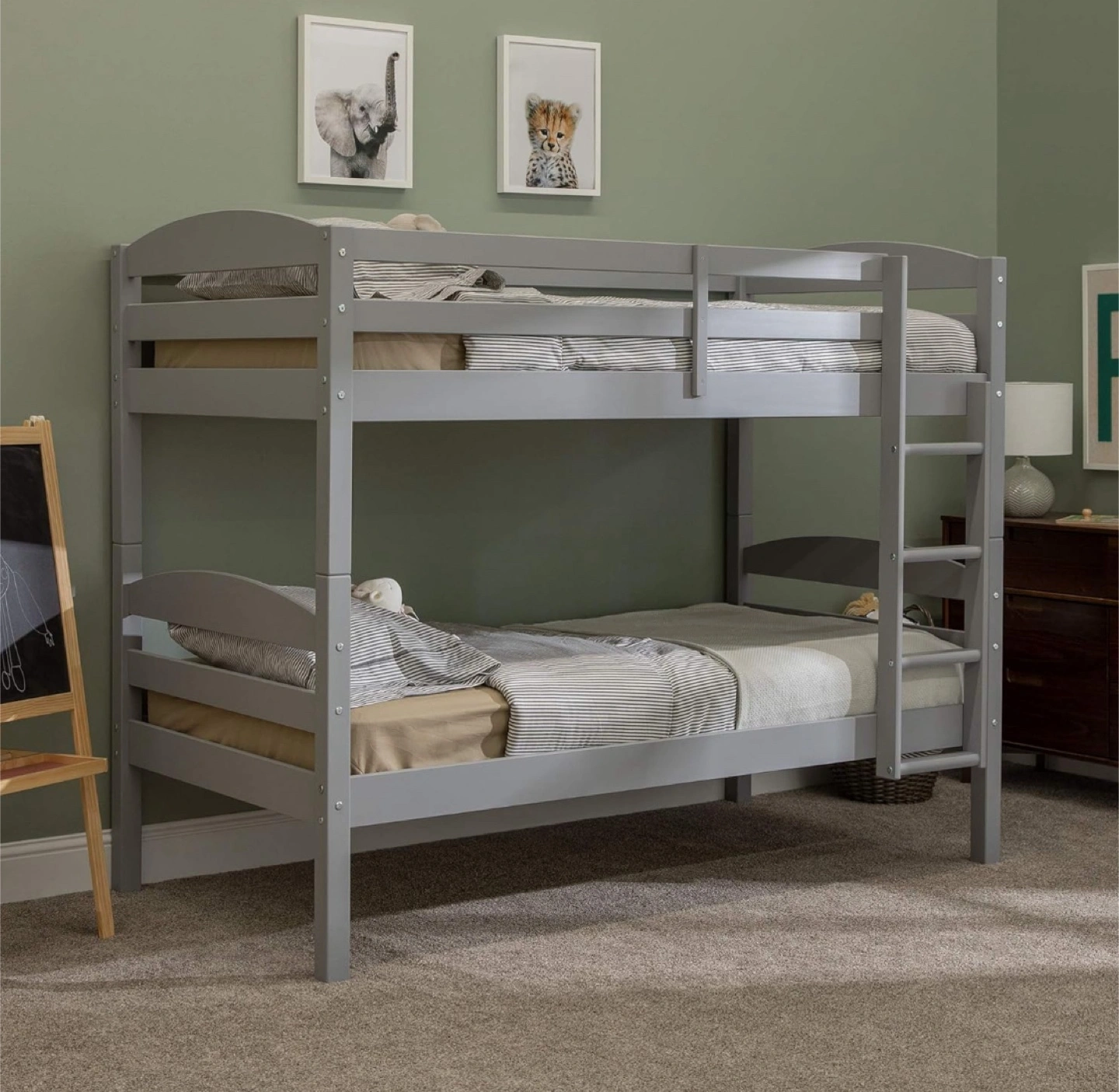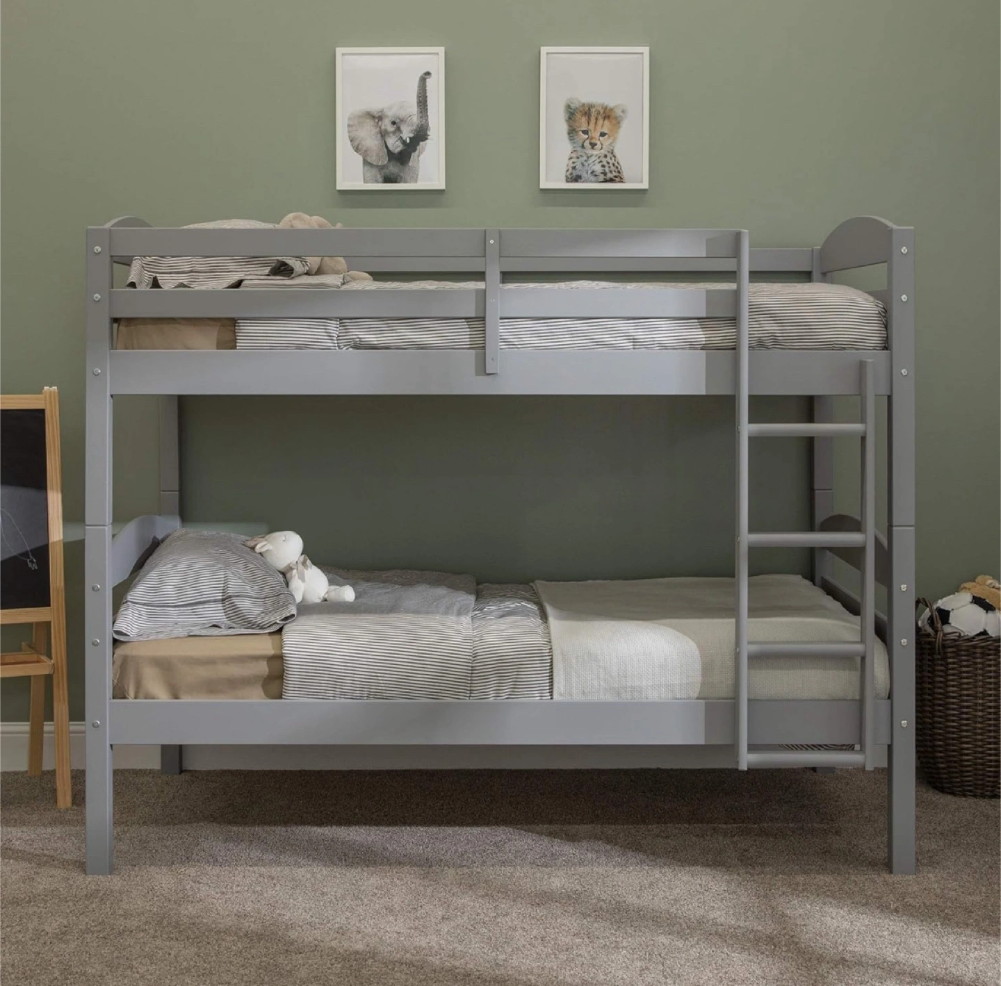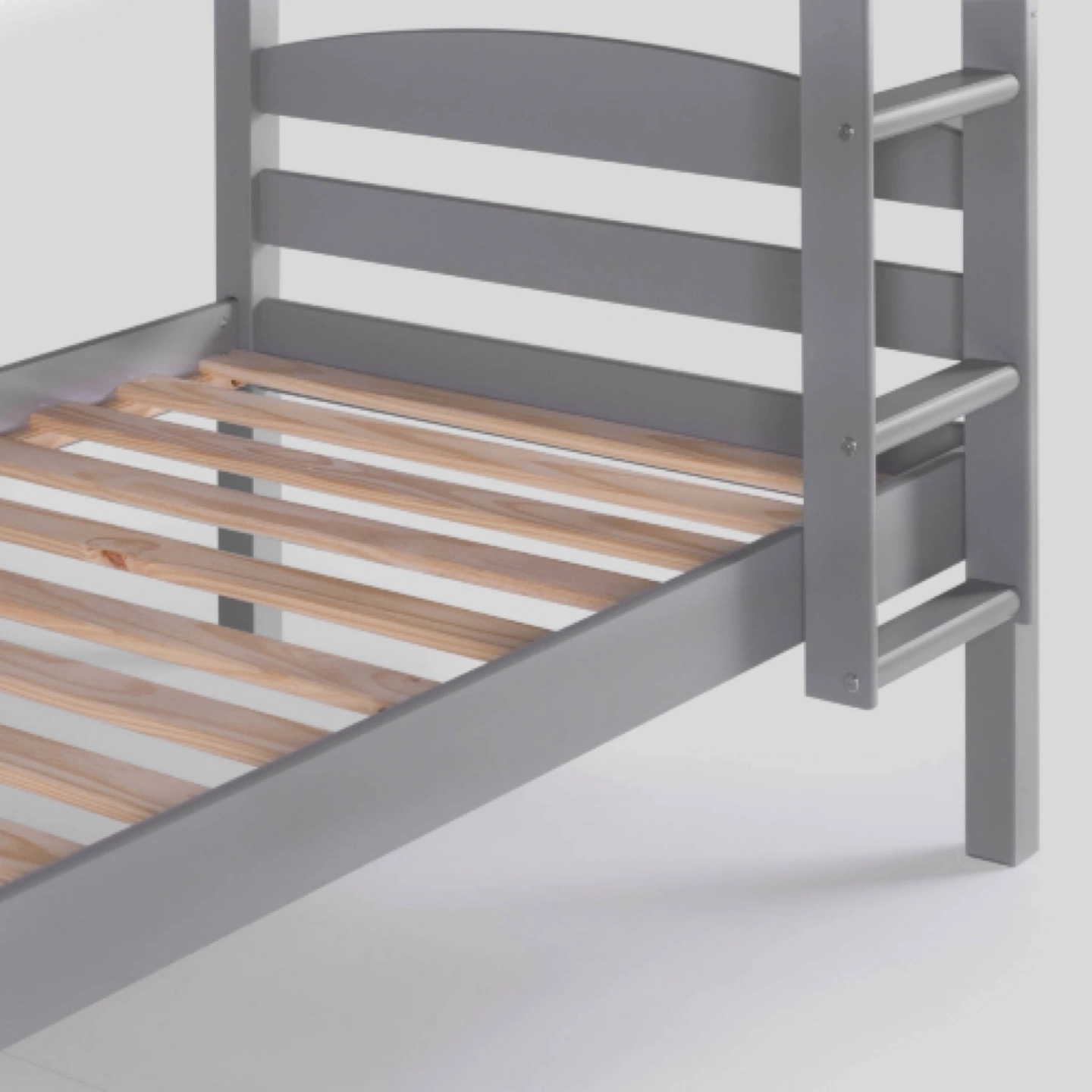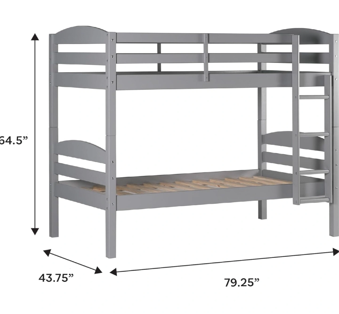 New Solid Wood Grey Transitional Bunk Beds - Twin Over Twin Dimensions: 43.75"W x 79.25"D x 64.5"H Headboard Height: 16.5" Footboard Height: 16.5" Leg Height: 12.25" New In The Original Box/Excellent Condition For Easy Transport in Vehicle Verified/Trusted Seller Read My Reviews!