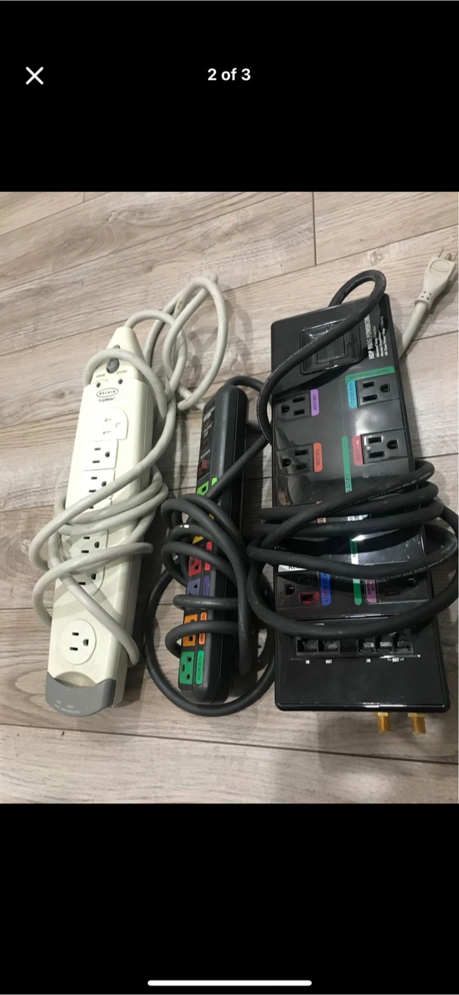 96A collection of power strips. Several outlets on each unit. Each has a power cable. Great for managing all your devices and their power needs with ease.