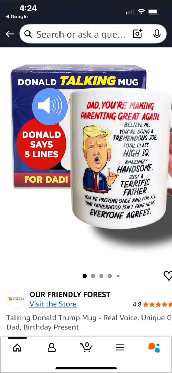 98Donald Trump talking Mug. Says 5 lines in Donald’s real voice. Excellent novelty Mug for Dad. Includes a box to store the mug. It would be great to take some time each morning to enjoy a warm beverage in a mug like this while hearing some of the Presidents sayings.