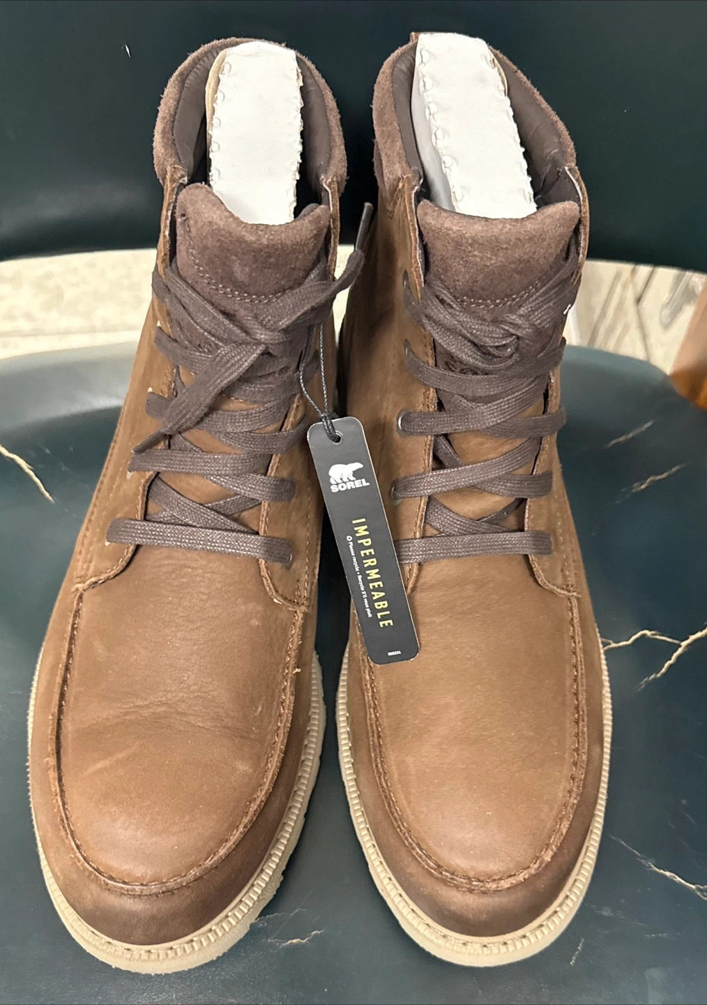 158Brown boots with laces. Features a white sole and a soft collar. These boots would be ideal for a calm walk in the woods.