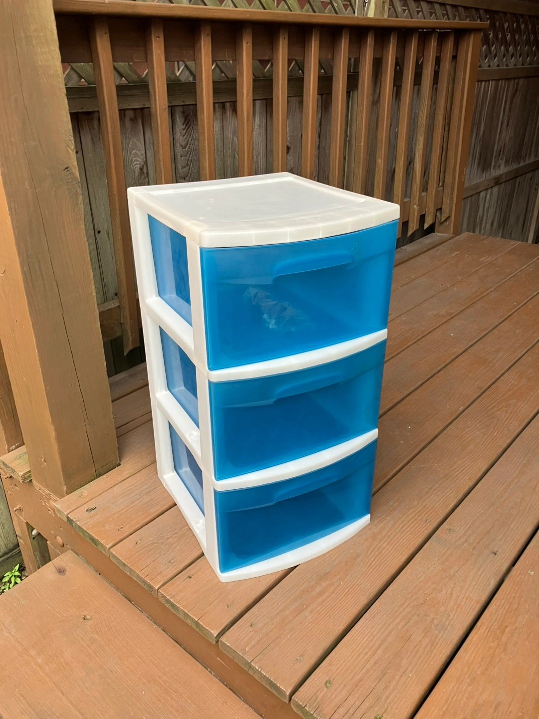 3 Drawer Cart Aqua Blue With Casters - 24” x 13” x 15” See-through Aqua tint drawers. Ergonomic handles. Brand new in original packaging casters, provide for rolling storage option. Cart is in good condition and works perfectly. Can be used with or without caster wheels. From a smoke and pet free home. Check out in person before purchasing. Thanks for looking.