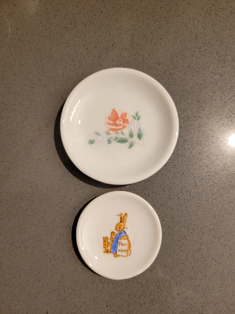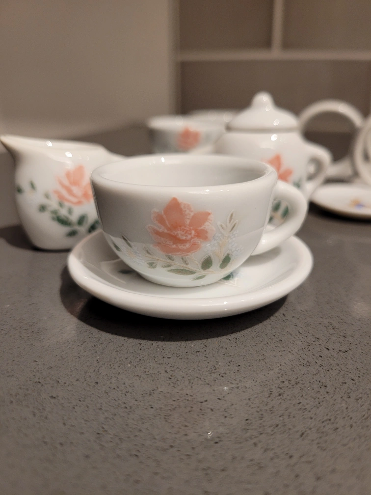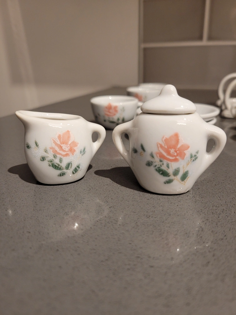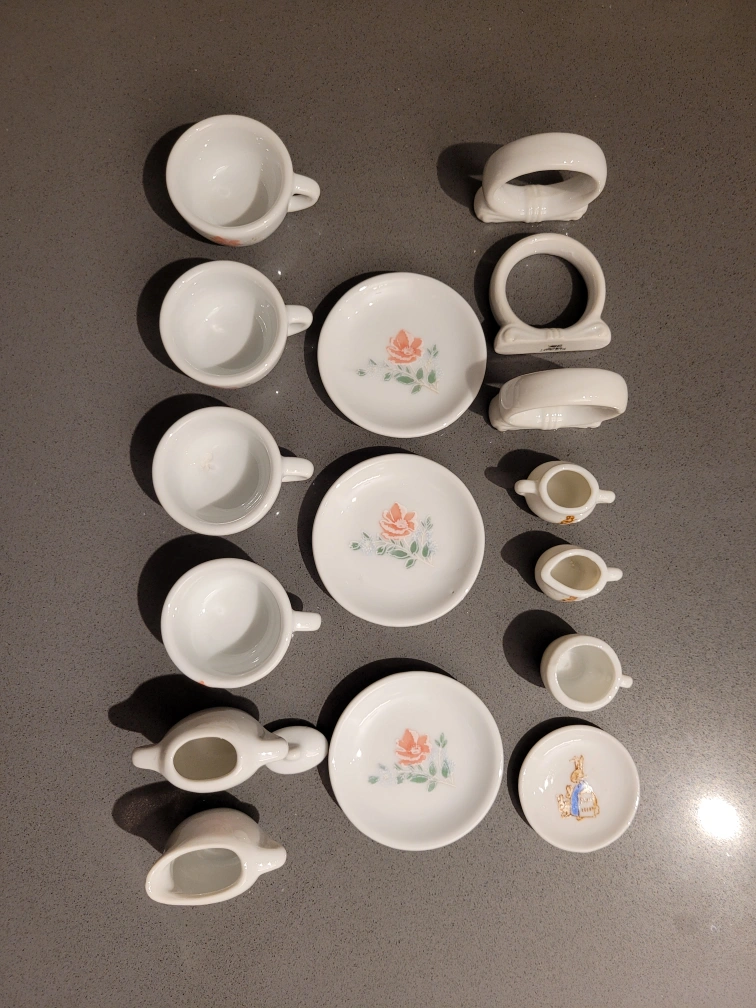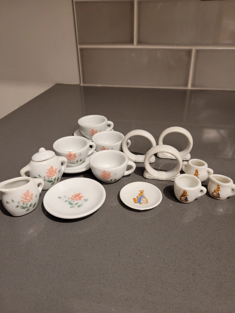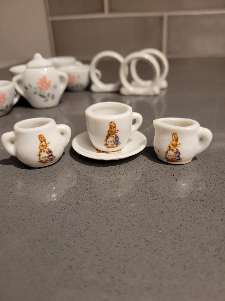 Adorable miniature tea set mix. Features delicate floral designs and some pieces with Peter Rabbit characters. Includes teacups, saucers, a creamer, sugar bowl, and a teapot. Use it to host a pretend tea party, and enjoy the quiet. Good condition just one tea cup has descripency see close up photo for condition. Feel free to check out my other unique items listed.