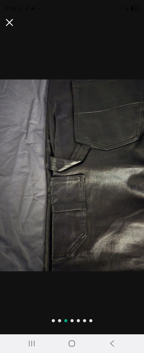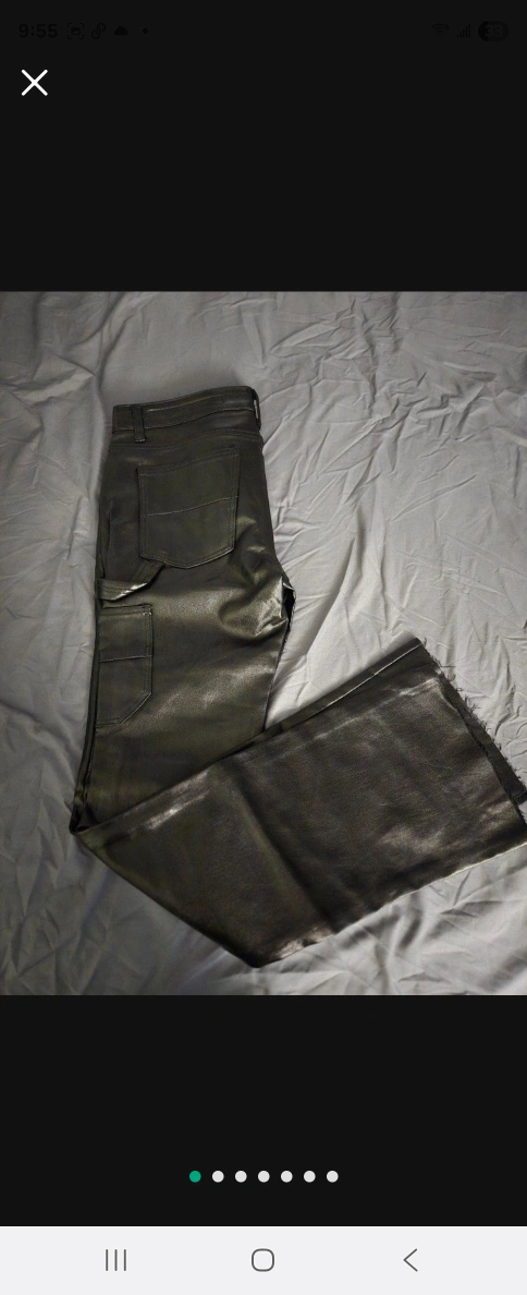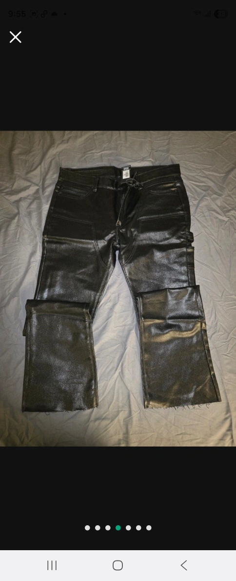 Metallic leather pants, complete with tags. Features front pockets. The flared-leg design gives off a chic look, perfect for a night out and a calm state of mind.