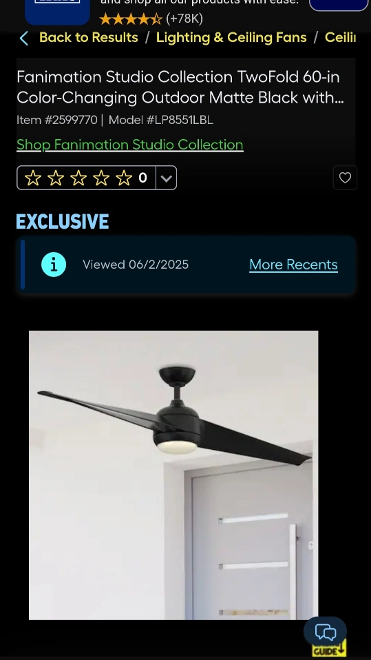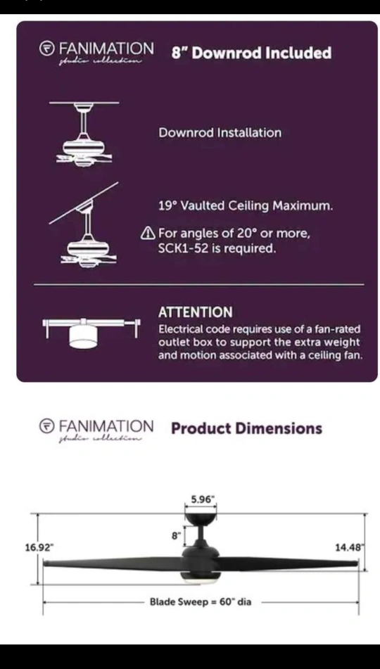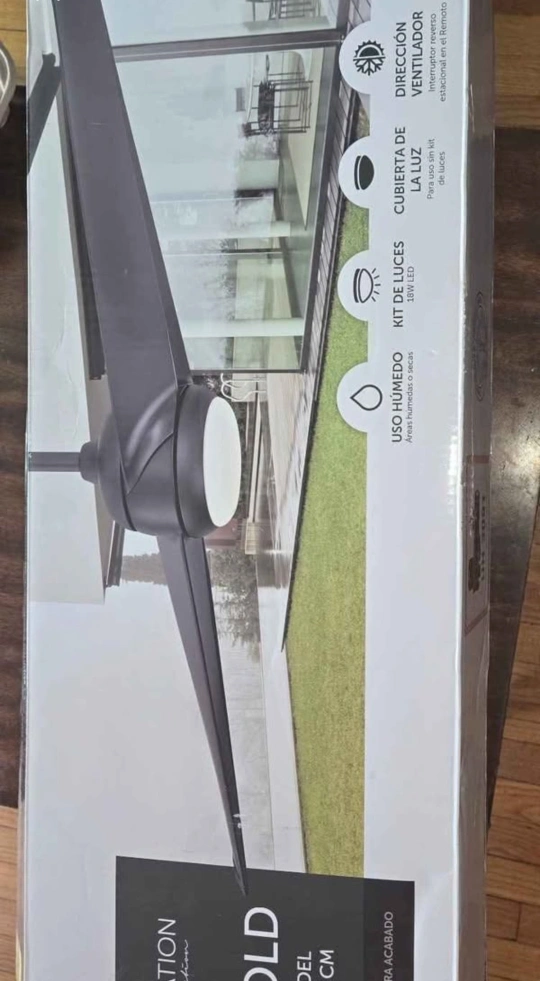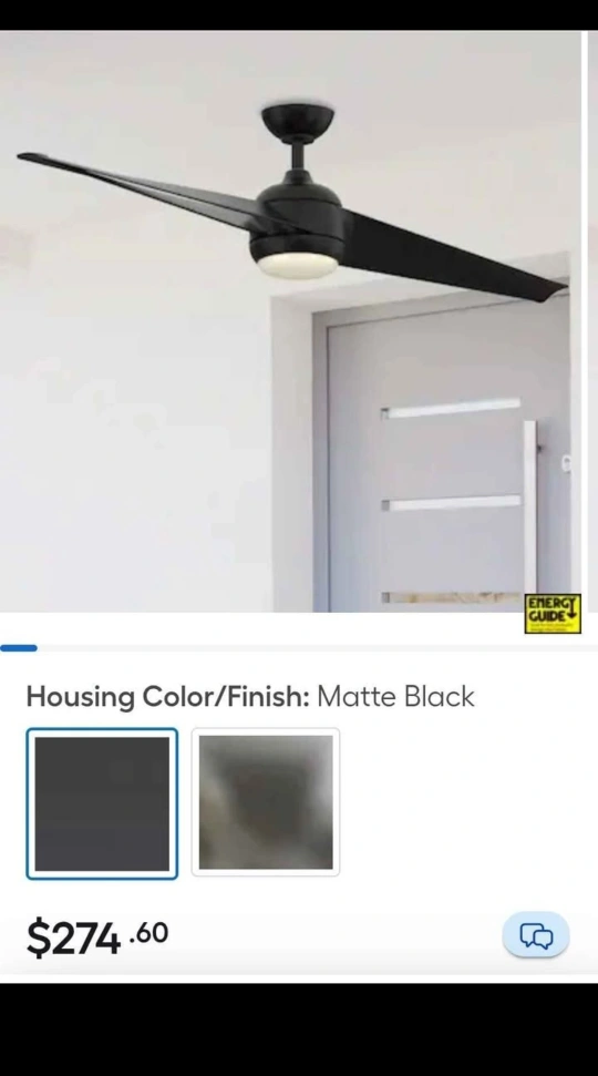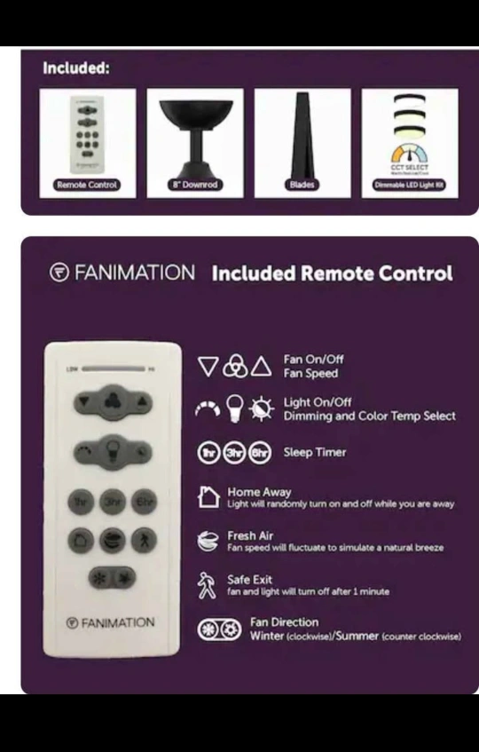 A ceiling fan with blades. Matte black finish, with included remote. The fan can bring a pleasant breeze during warm days.