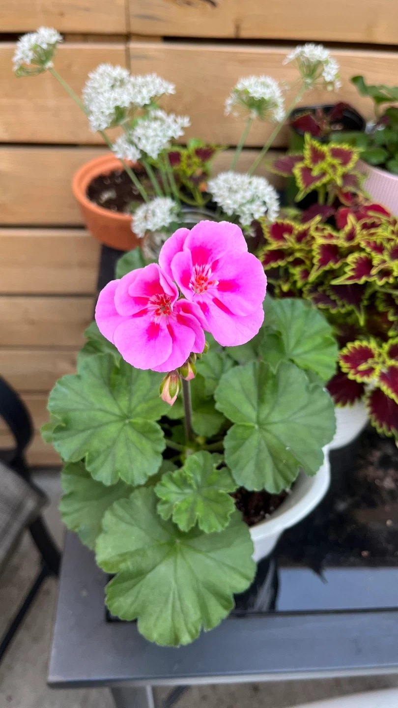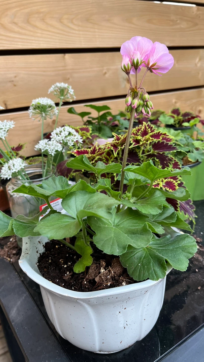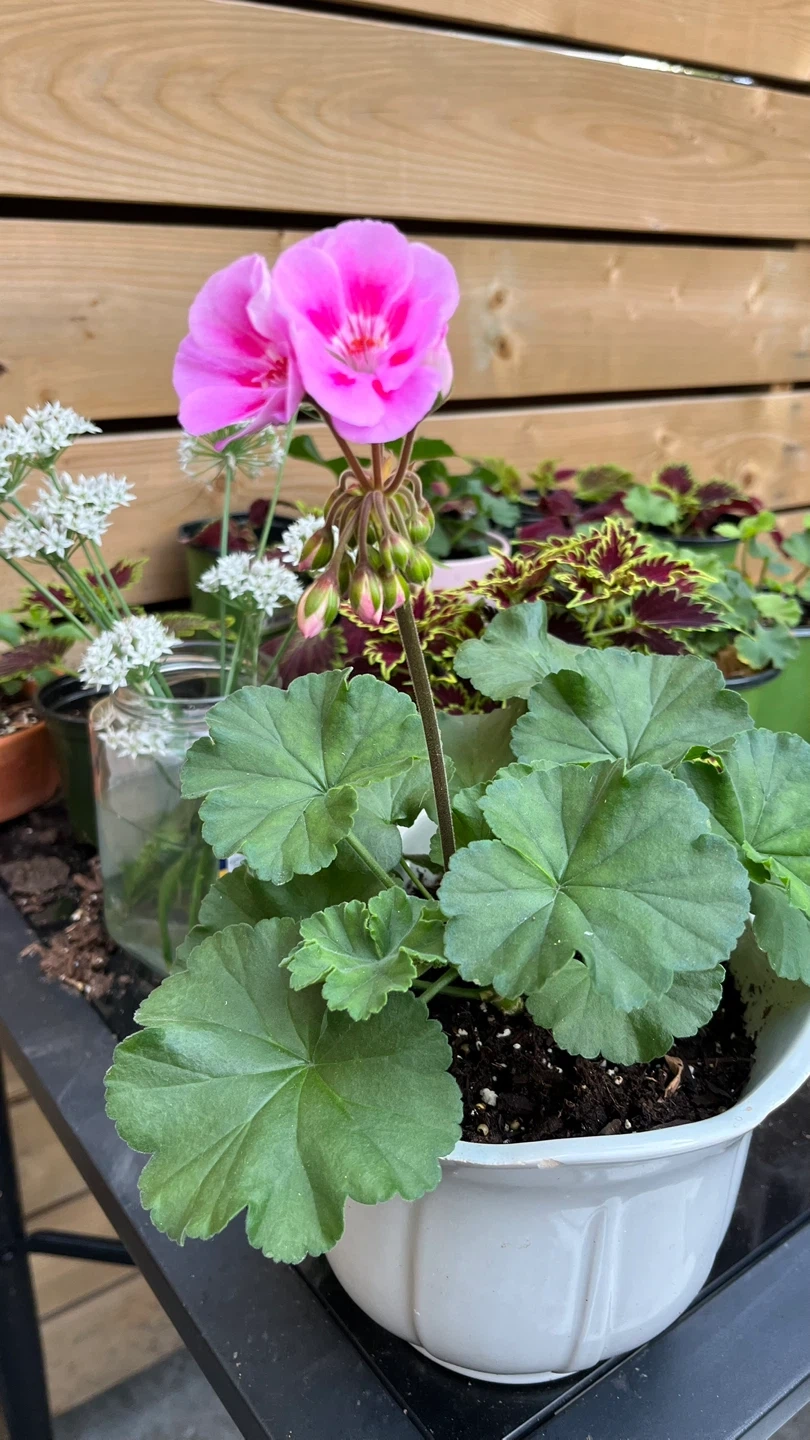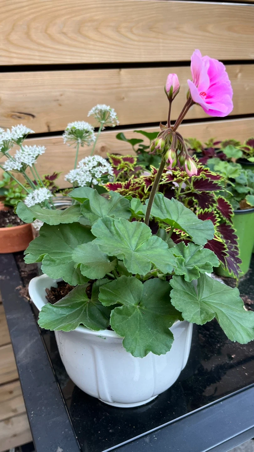 Selling a beautiful pink geranium plant in a white pot. It's a lovely addition to any garden or indoor space! The plant is healthy and well-cared for, ready to bring some colour to your home