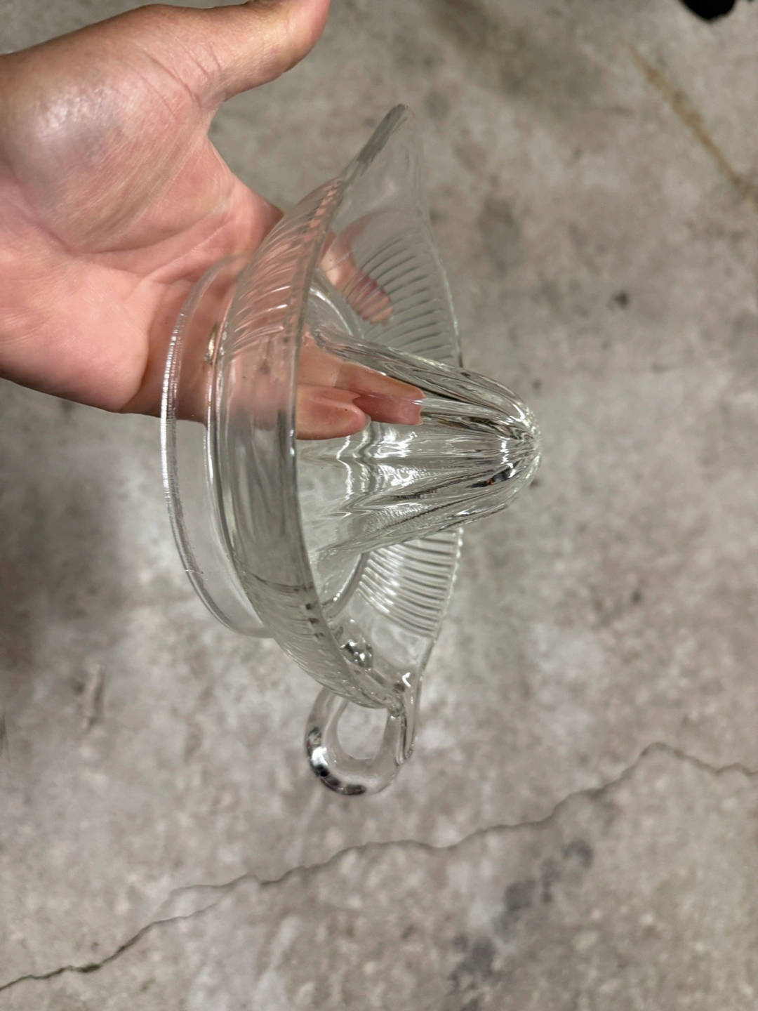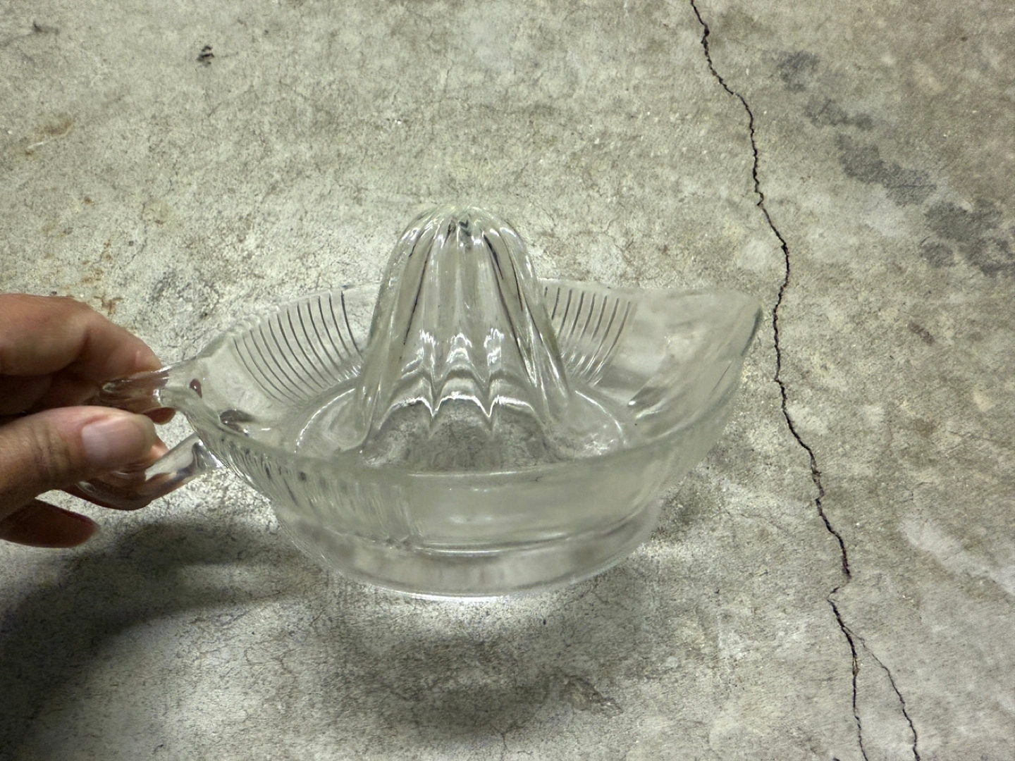 A clear glass juicer. It features a ridged interior. A small spout is on the side. The juicer will make the perfect addition to any kitchen. Pick up at Irving Park and Cumberland