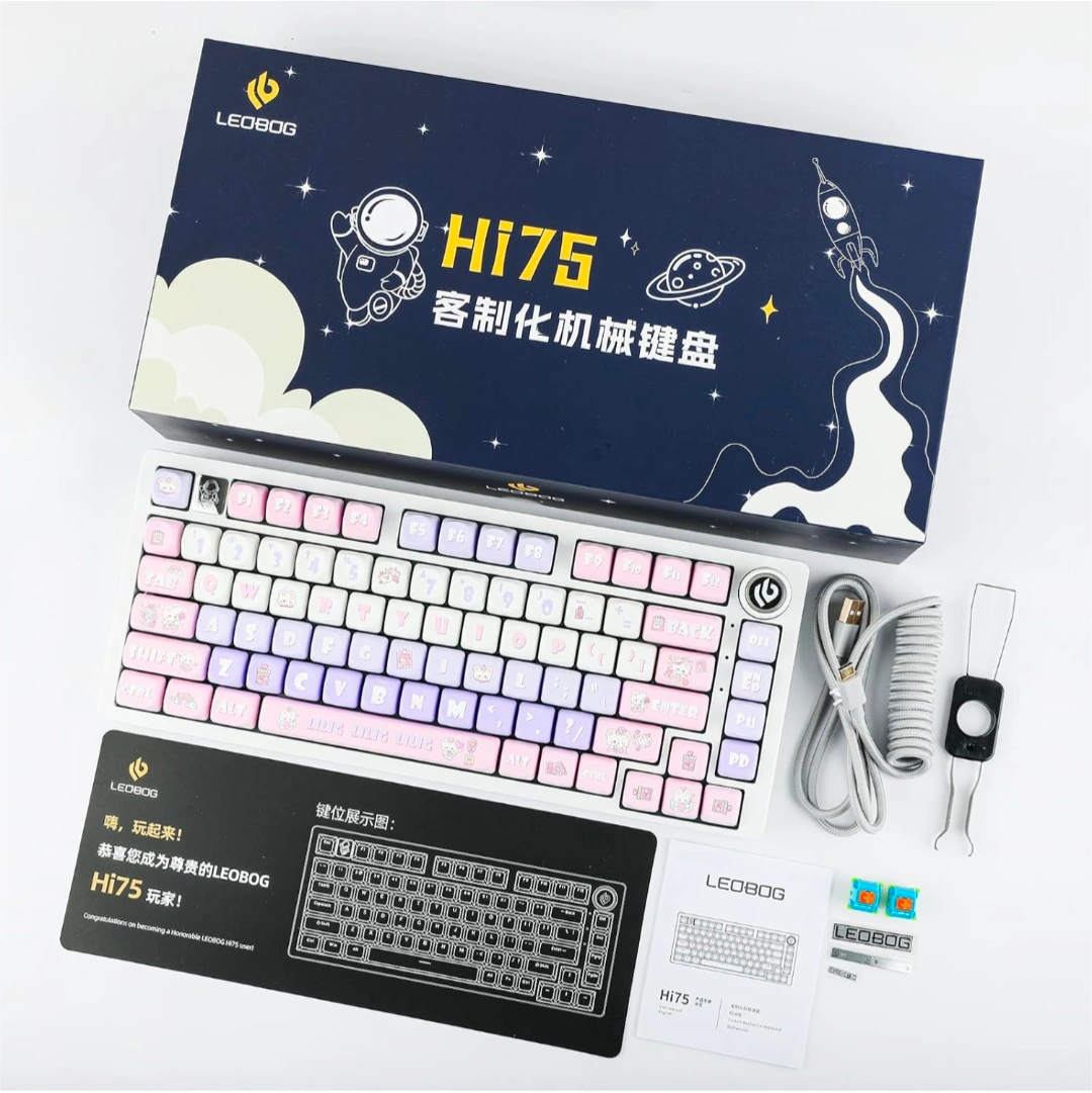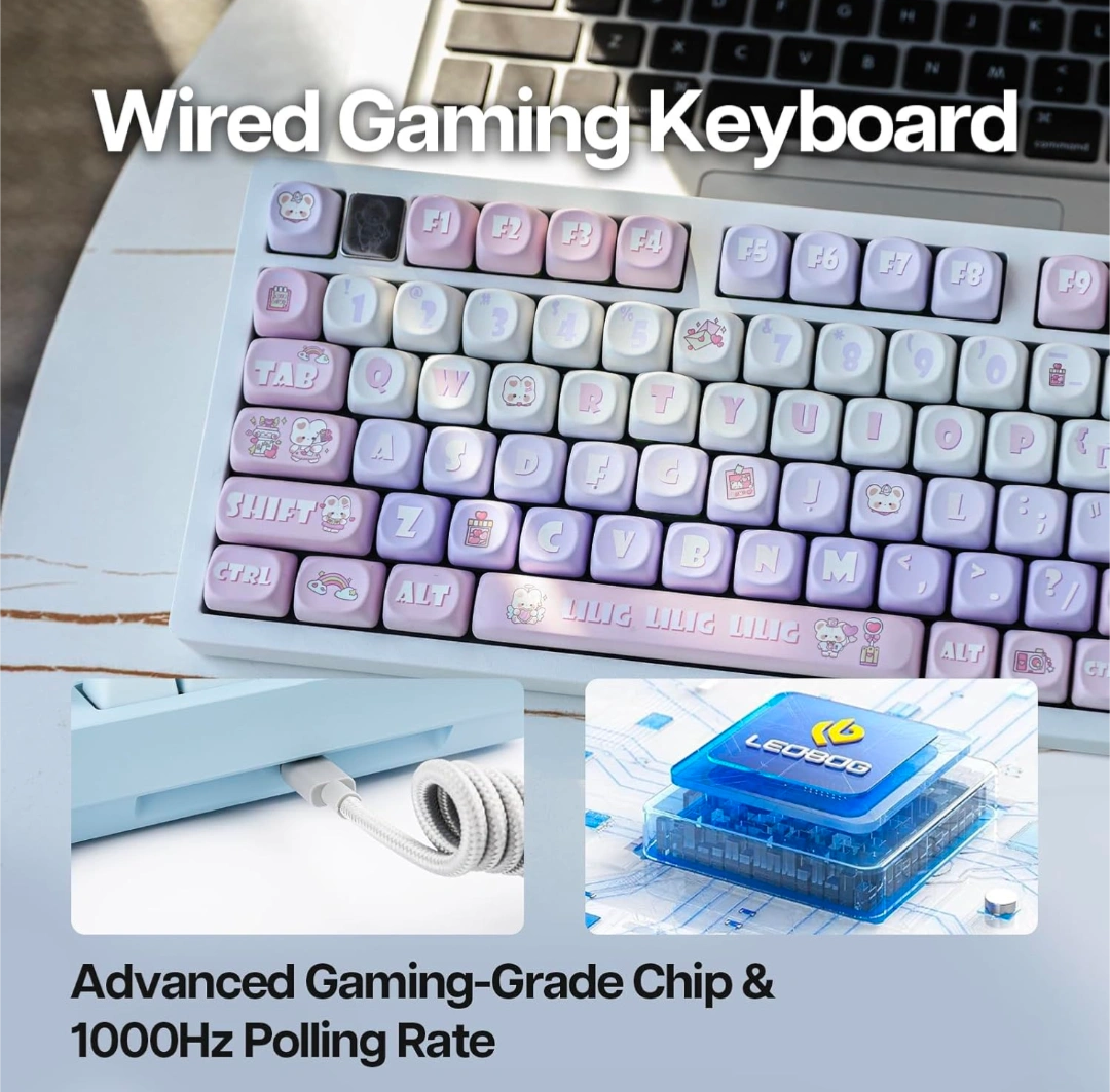 Stylish gaming keyboard. Includes a knob and cute keycaps. The keyboard is wired. You can regulate color with the knob. Looks very cool. New in the box