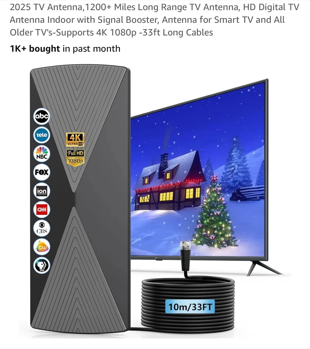 This antenna offers a long range, and supports 4K 1080p. Easy connection with USB port or power adapter. A great way to relax and watch your favorite channels. Originally a $45 antenna.