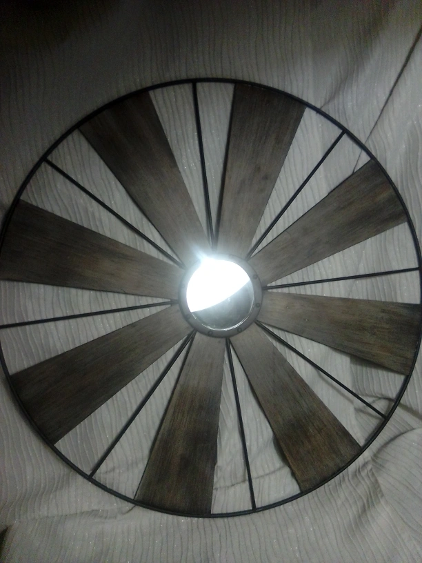 335A decorative mirror featuring a wheel design. Dark wood and metal frame surround a circular mirror. Perfect for creating a sense of peace within your home.