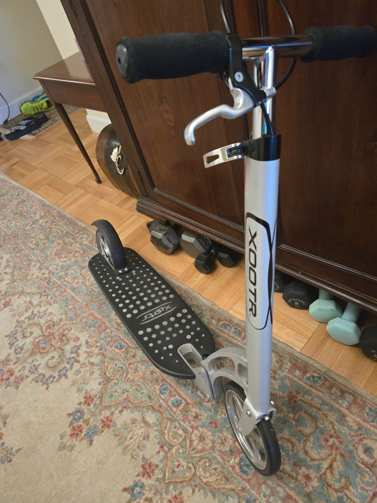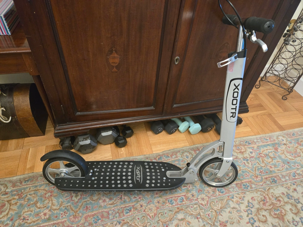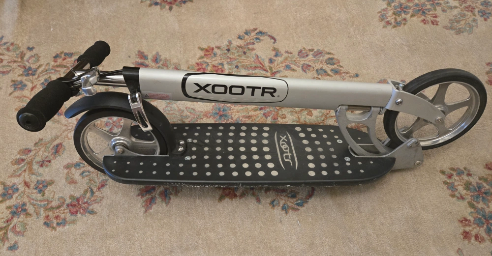 92Adult/teen Xooter scooter with a black deck and silver frame. Equipped with hand brakes. The scooter folds for easy storage. Use it for a leisurely ride. Used maybe 10 times. Was $350 new.