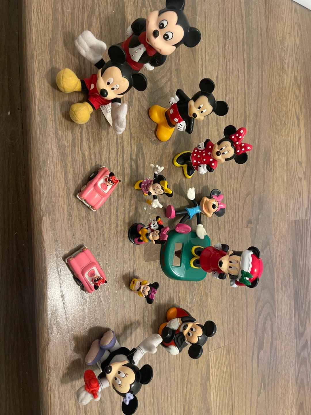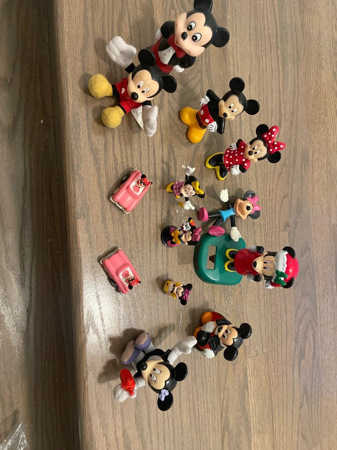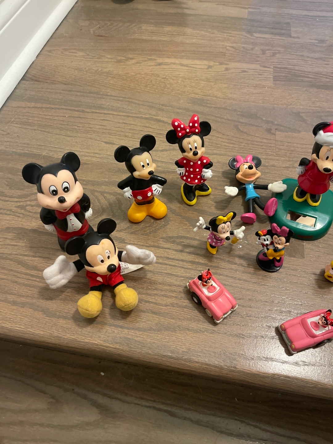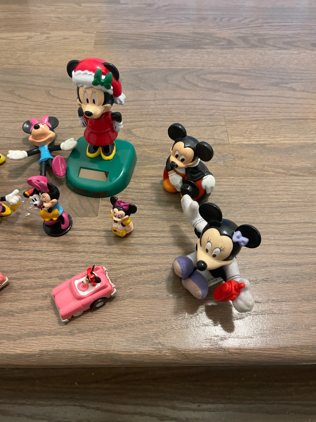 196A collection of Mickey and Minnie Mouse figurines. Includes a mix of sizes and styles, with a car and accessories. These figures are sure to bring joy to your collection or play time.