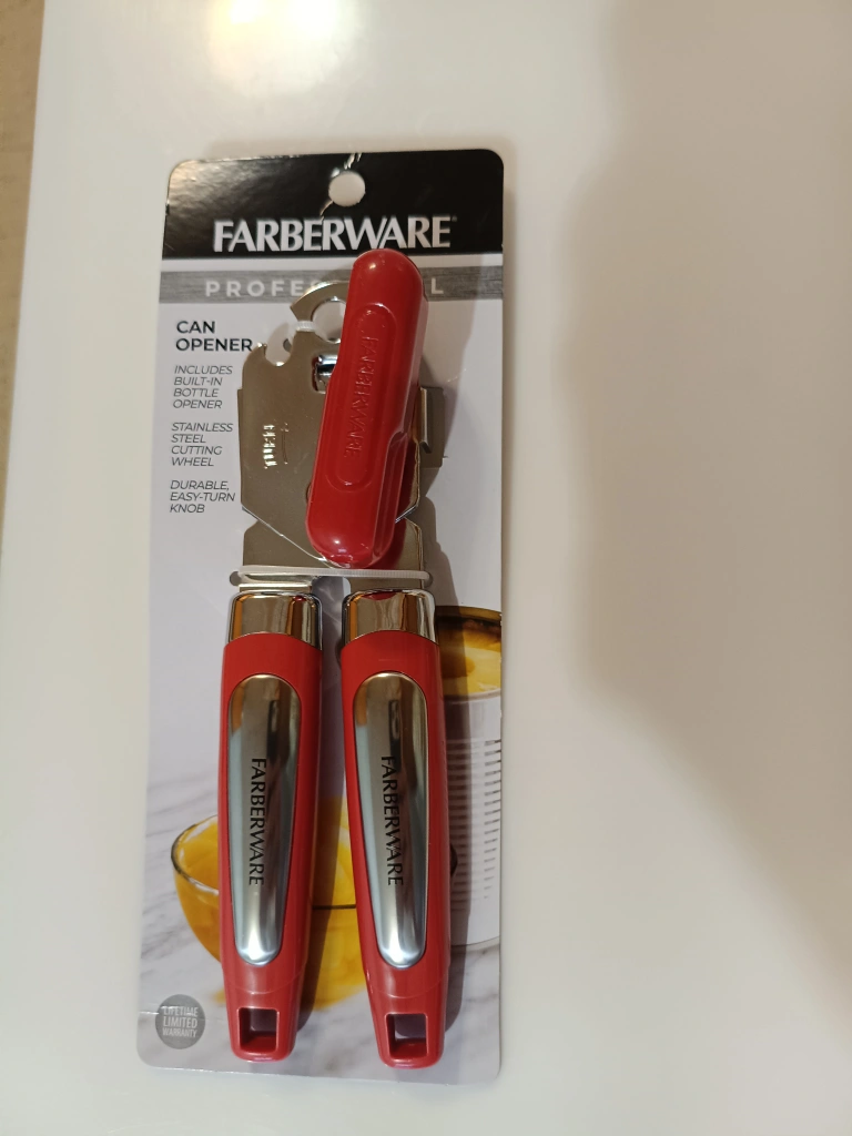 5A new Farberware can opener. Features a stainless steel cutting wheel and a built-in bottle opener. This item would be perfect to use after a long, hard day to make a quick and easy dinner.