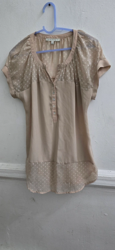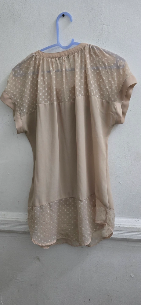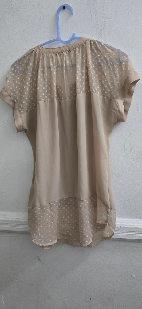 10A stylish blouse in a soft beige color. Features a unique polka-dot pattern on the upper and lower sections, creating visual interest. The button-down front adds a touch of sophistication. This blouse is perfect for creating a stylish and effortless look.