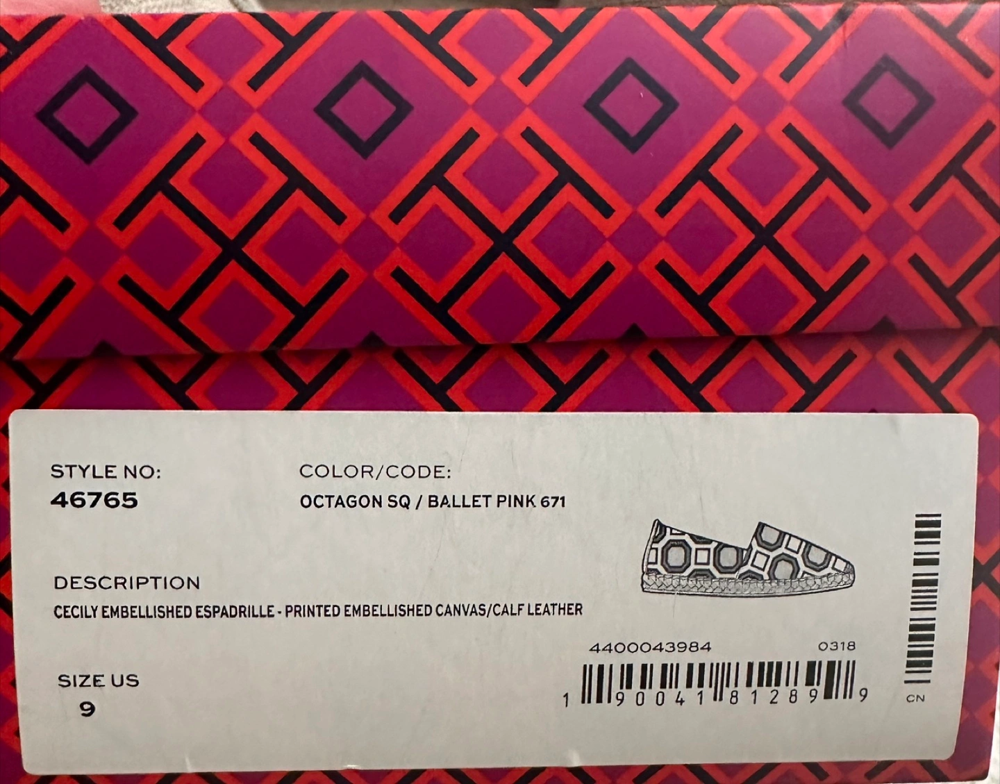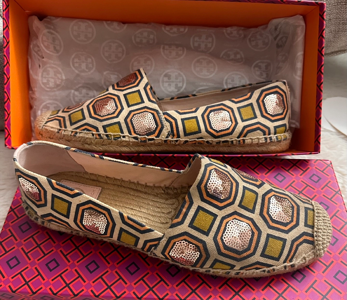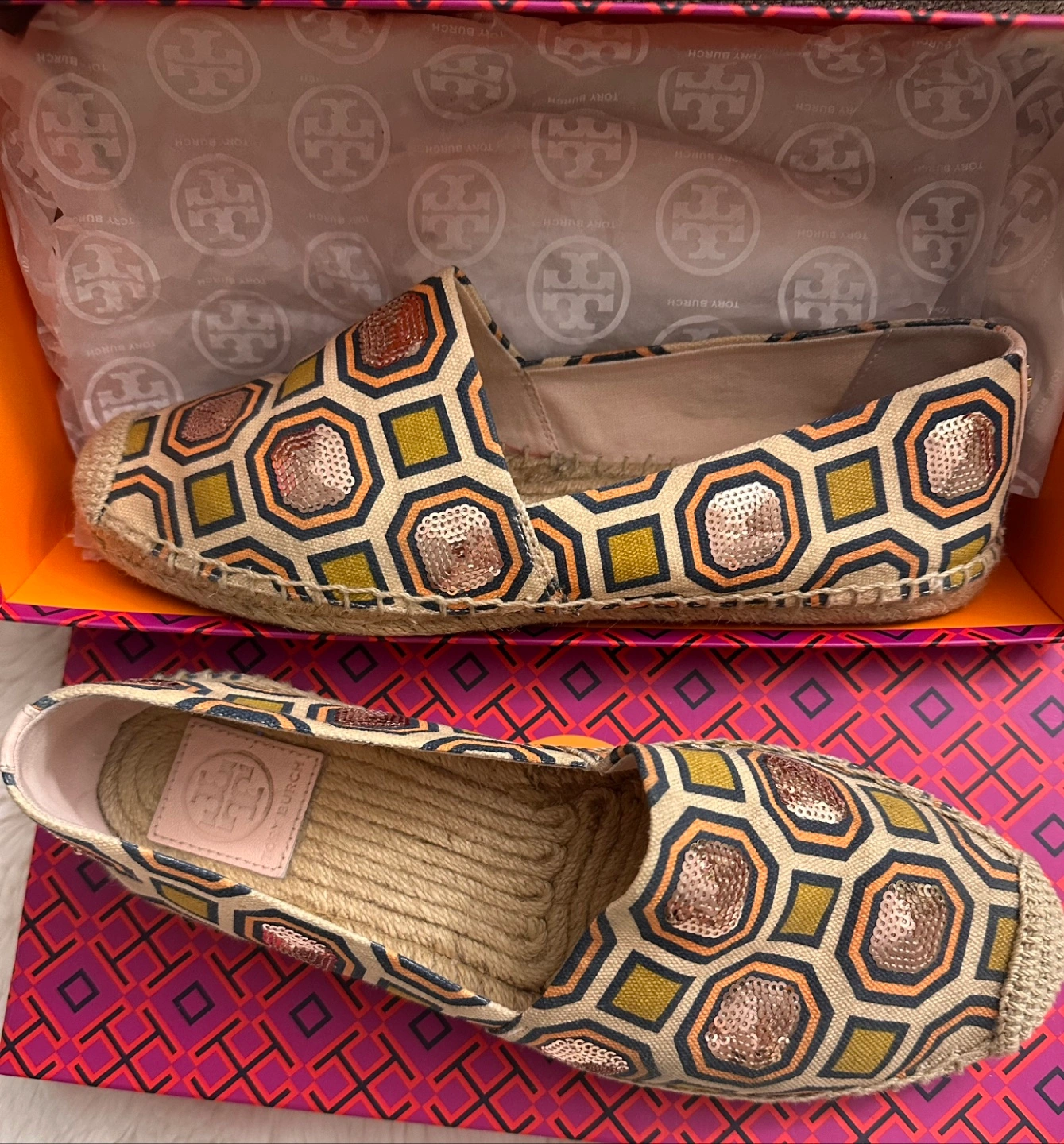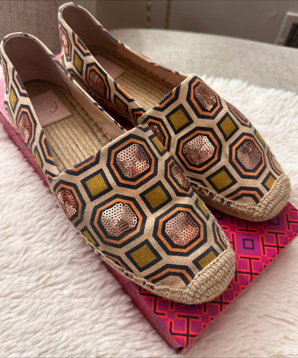 Lovely espadrilles with a geometric print. They have a fabric upper with embellishments.