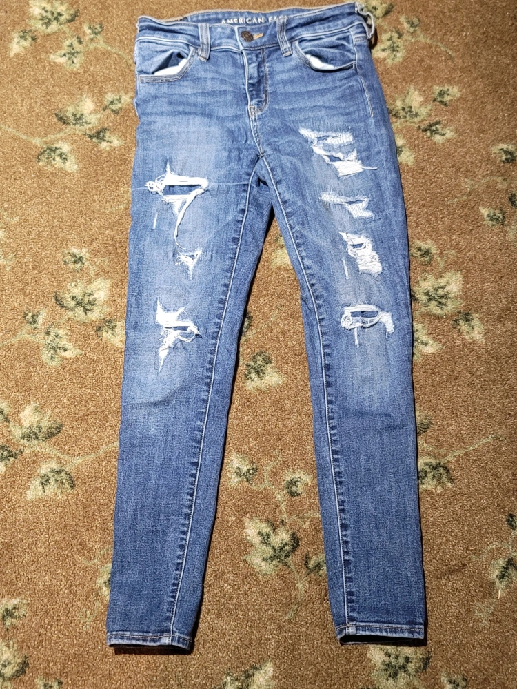 18These jeans are blue. They feature distressed details. They have pockets in the front and back. A perfect piece of clothing for any occasion. cash and pick up only $10 each