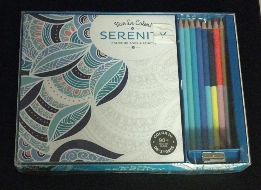 Serenity Coloring Book & Pencils Set. I have a coloring book with pencils. It comes in a box. There are tear-out pages and a pencil sharpener. Coloring these pages can be a great way to reduce stress.
