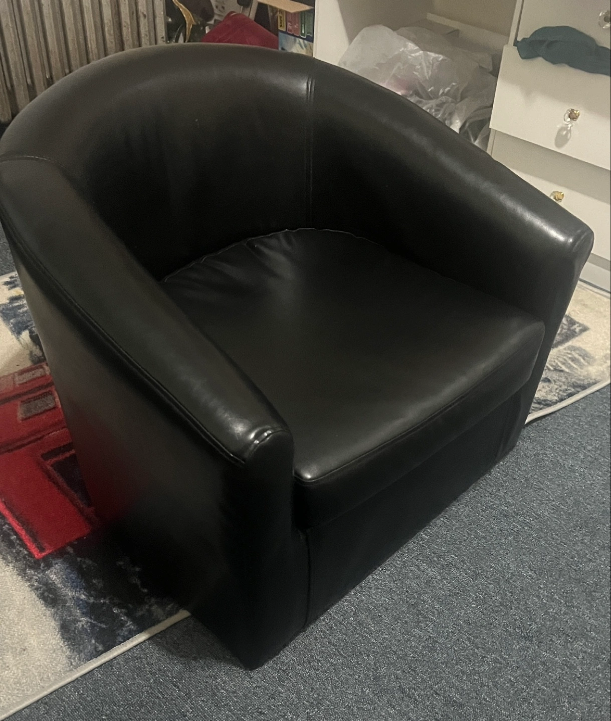 Black armchair. Features curved back and armrests. I bought it for 90$ in amazon but I don’t longer need it.