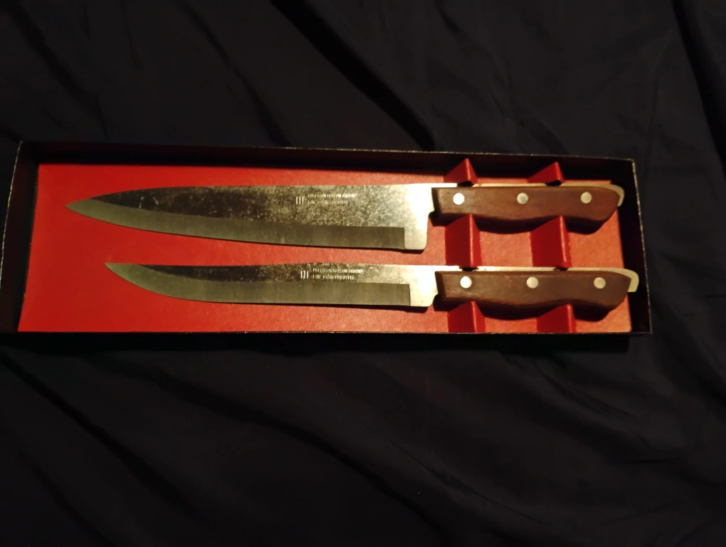 Set of two Maxxum knives. Includes two different sized blades, stored in a red and black box.