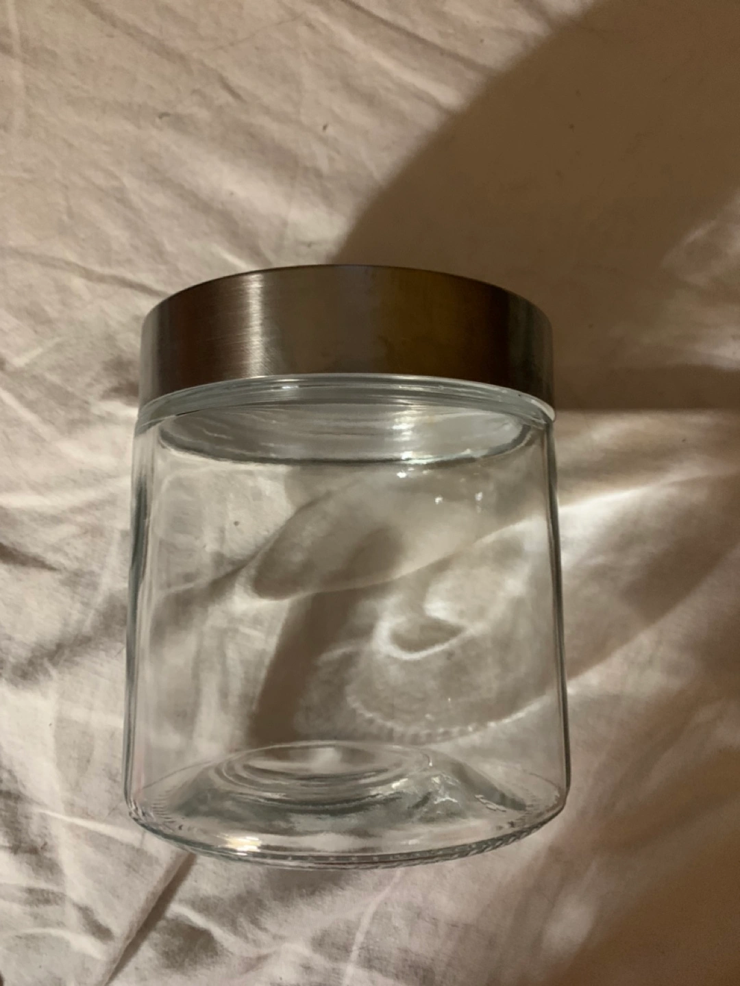 Clear glass jar with a metal lid. Offers a cylindrical shape. Suitable for storing many small items. Price is for 3 all the same size
