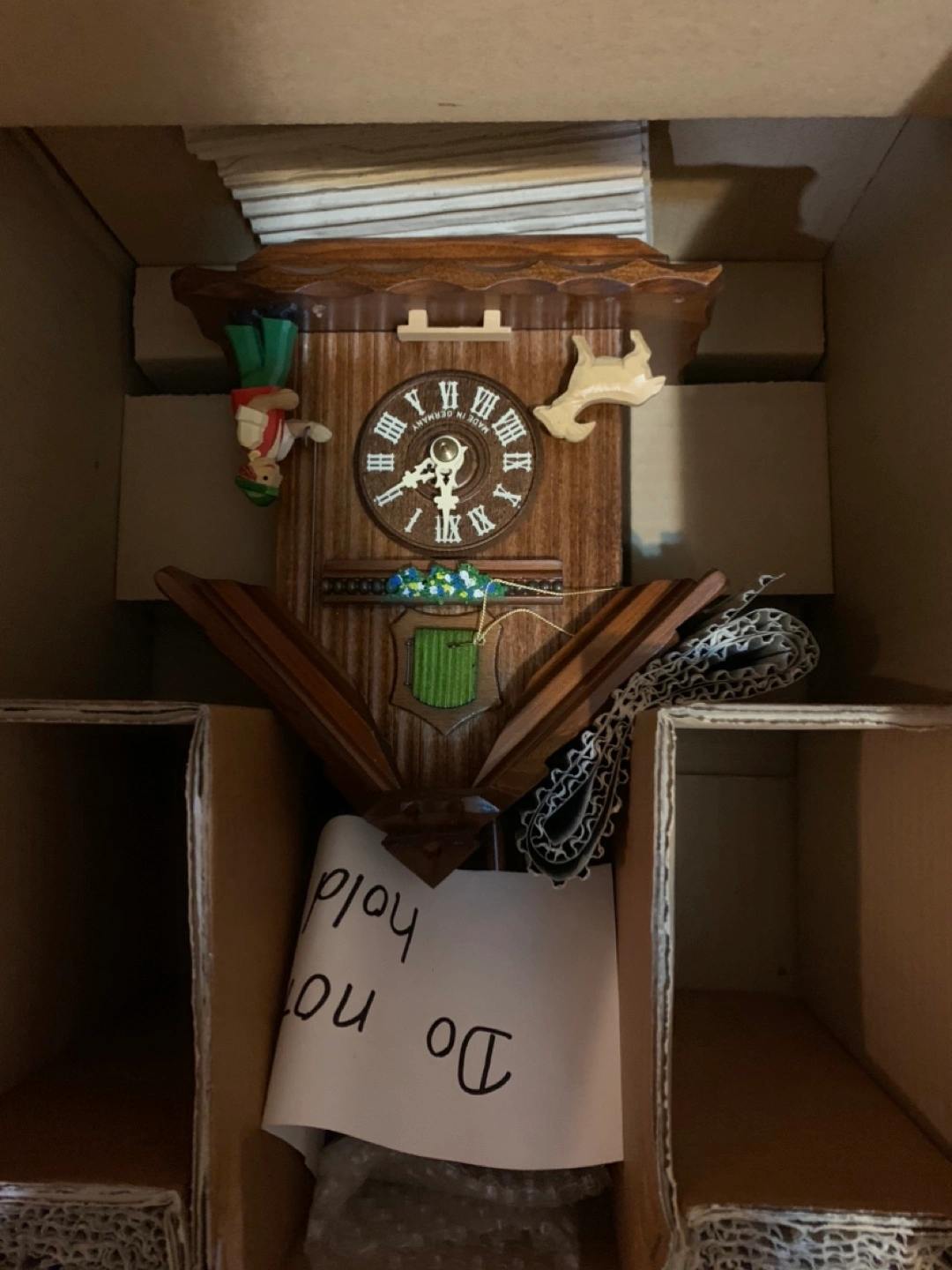 Cuckoo clock, still in its original packaging. Features classic clock hands, and a detailed wooden exterior. A perfect addition for the cozy home.