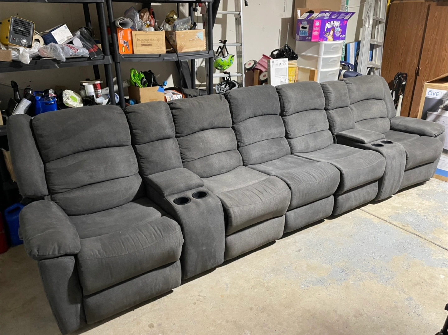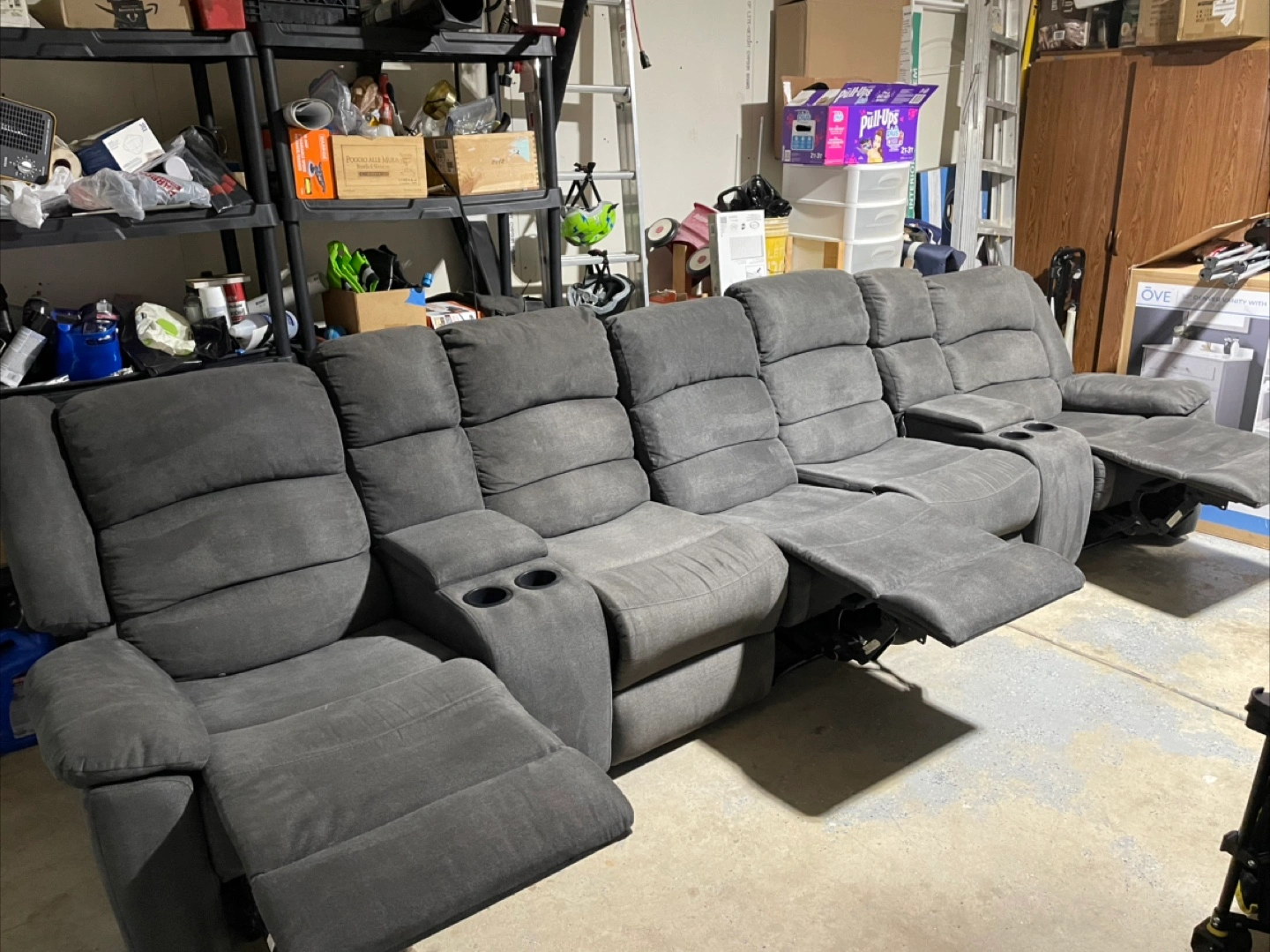 10Sectional couch. Gray fabric. Features multiple reclining seats. Includes cup holders in some armrests. Such a comfy couch to sink into after a long day. Extra additional seat brand new - never used due to space limitations.