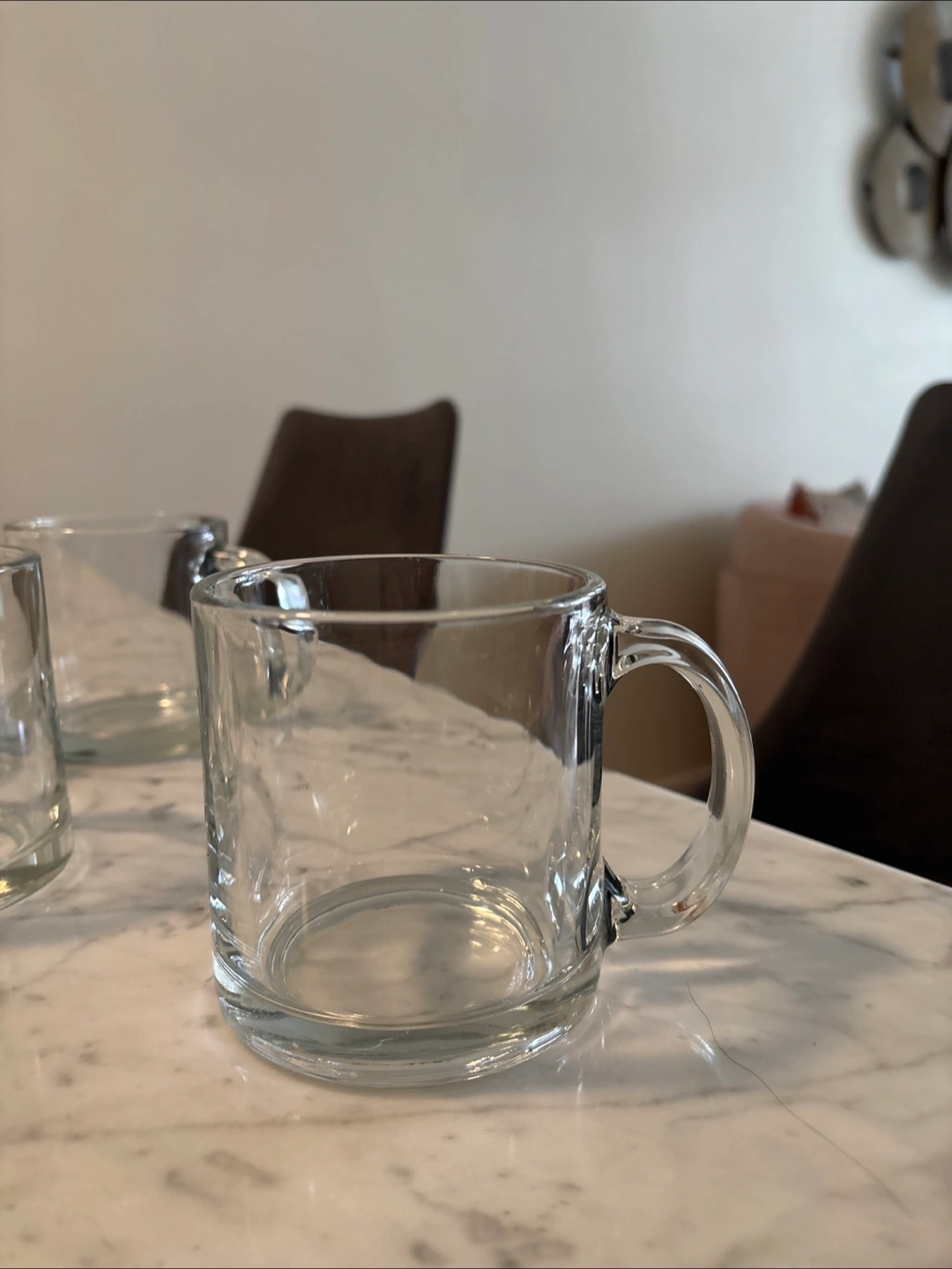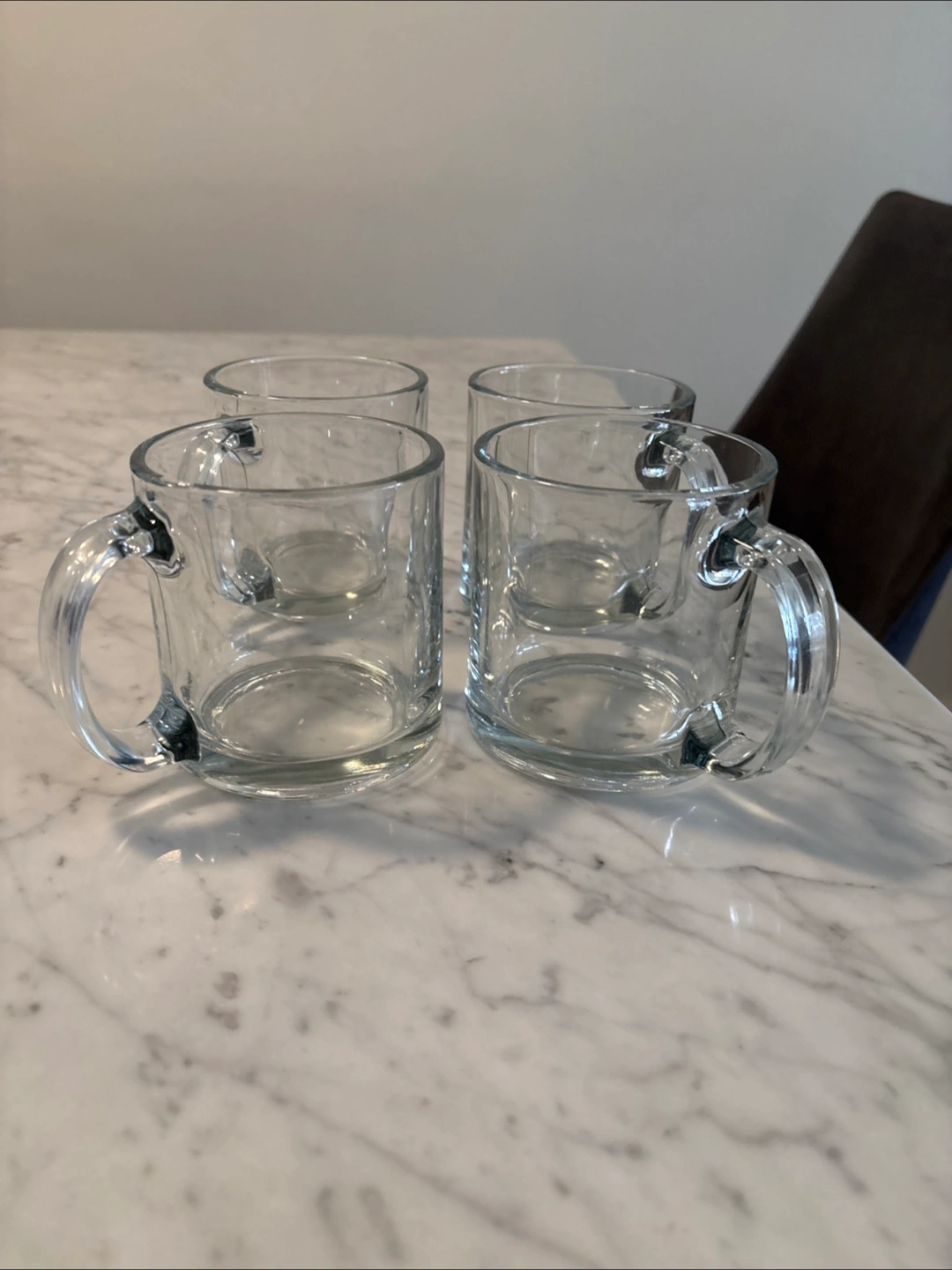 347Set of four clear glass mugs. Each with a handle. Perfect for sipping tea or coffee while relaxing and taking a moment for yourself.