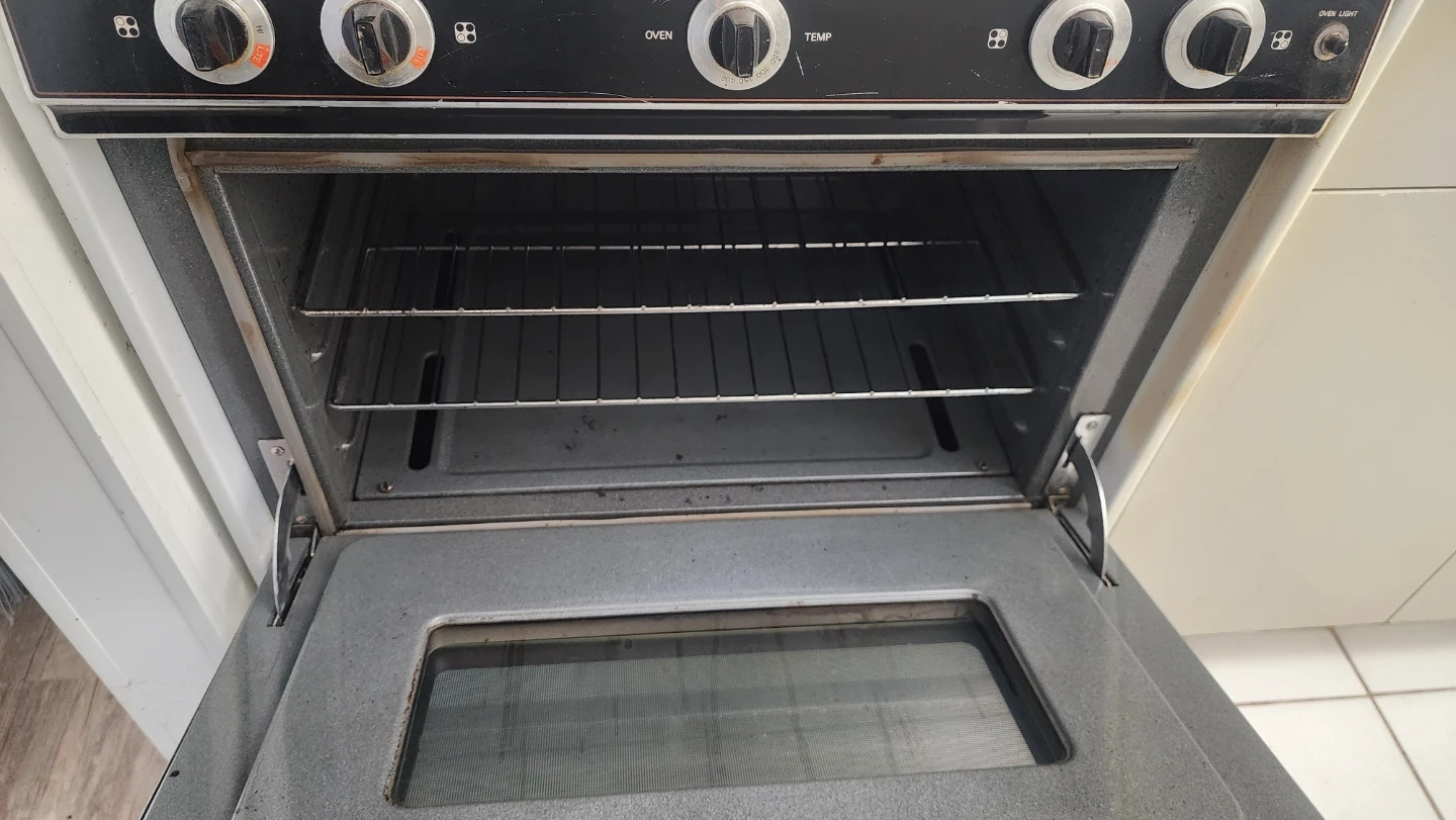 This is a white GE electric gas range stove with a built-in oven. It features four burners on top and an oven with racks inside. This appliance is a white freestanding unit. Ild model bit everything works perfectly.