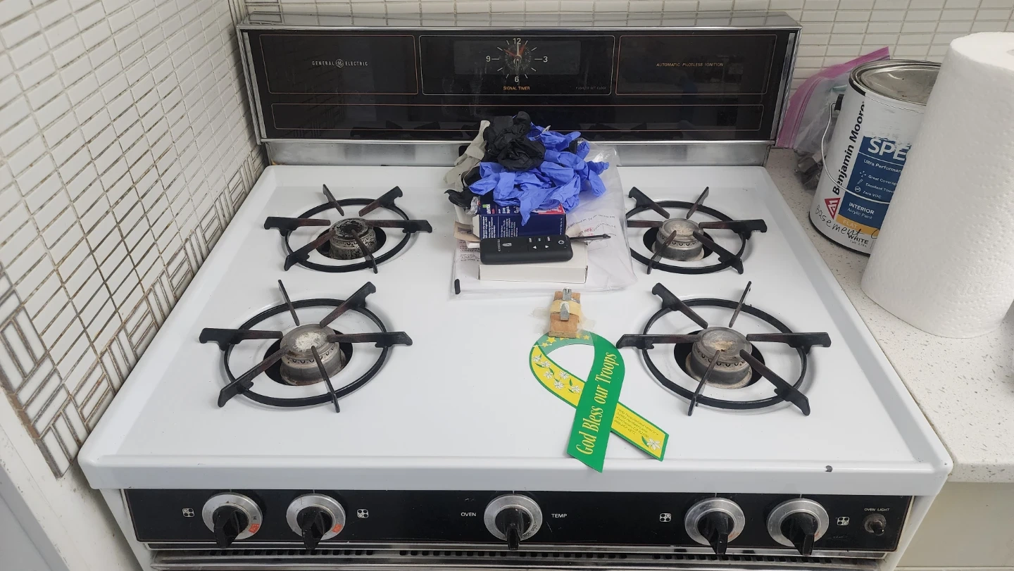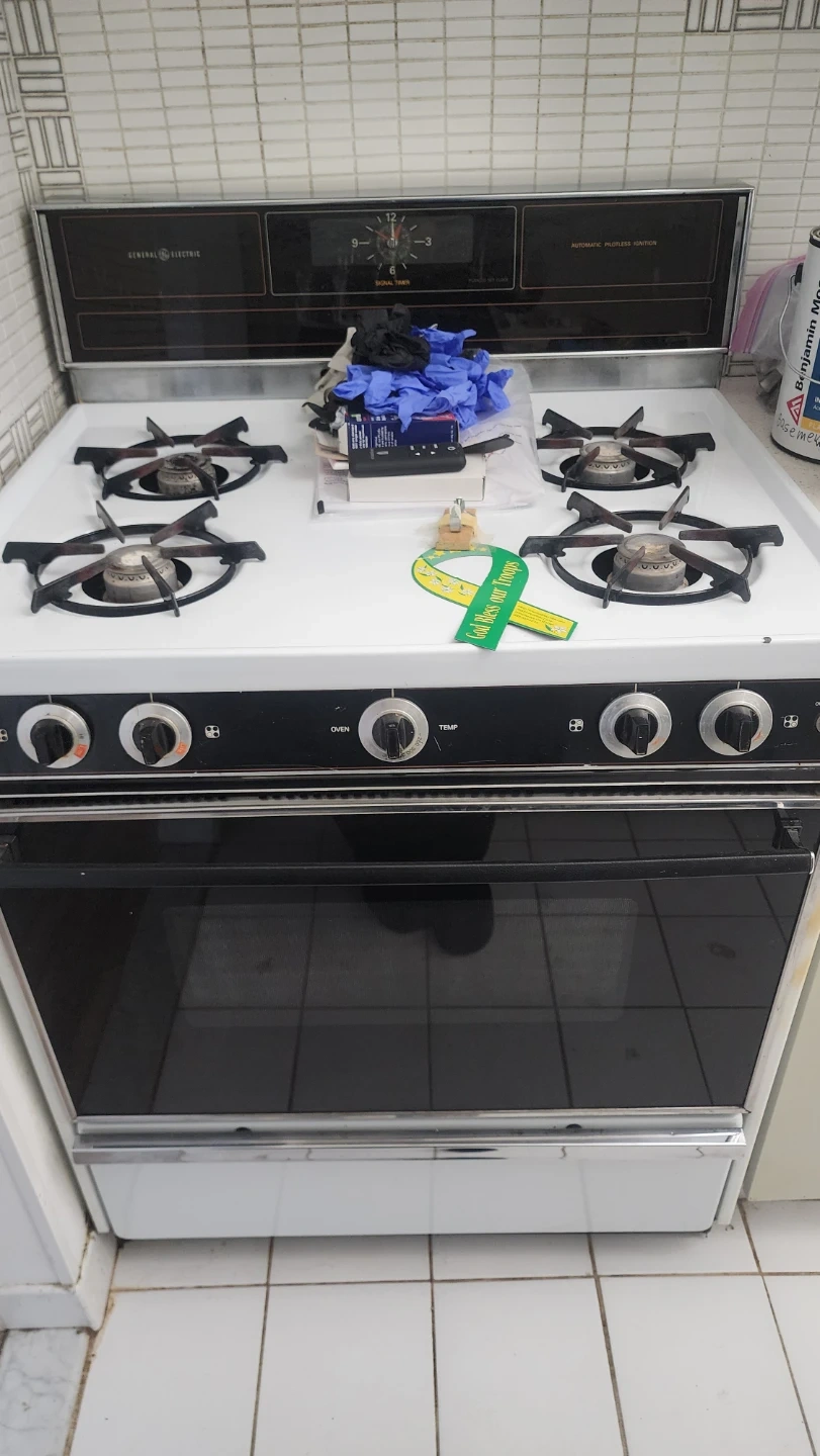 This is a white GE electric gas range stove with a built-in oven. It features four burners on top and an oven with racks inside. This appliance is a white freestanding unit. Ild model bit everything works perfectly.