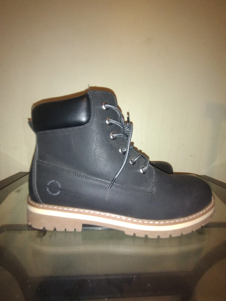 134Boots in a dark color. Features laces. They have a light sole with a tread. These boots can be great for taking a peaceful walk.