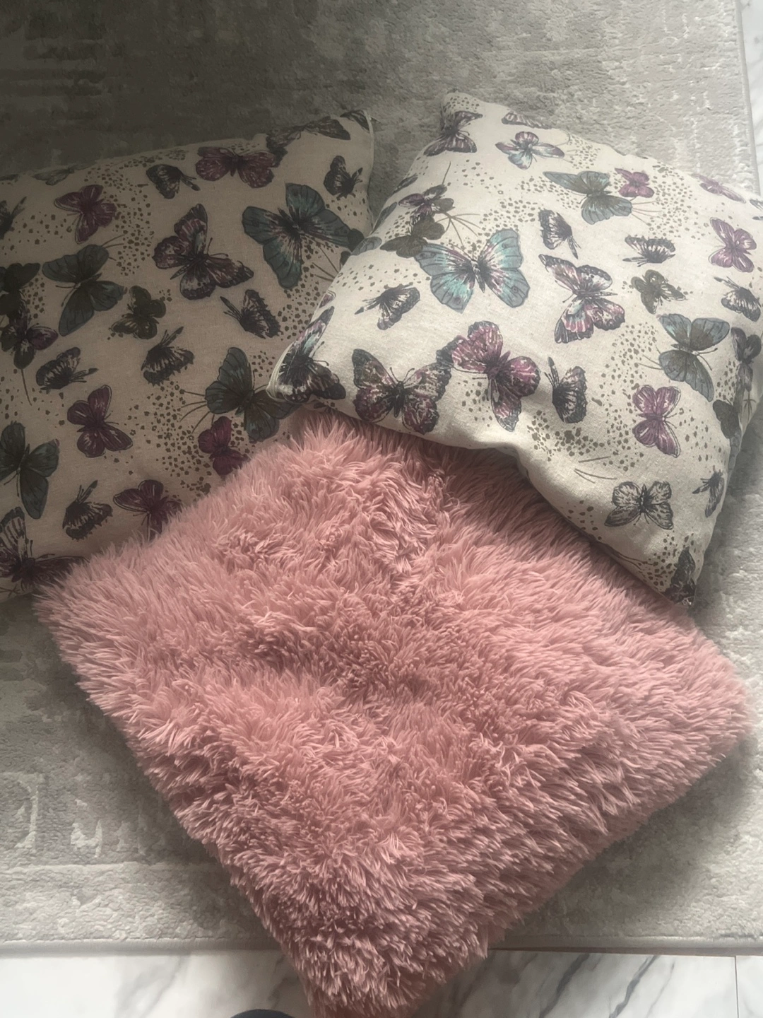 I am offering a set of lovely cushions. Two cushions with butterfly prints. A fluffy, pink cushion completes the set. Adding these cushions to your bed or couch would certainly be a cozy addition.