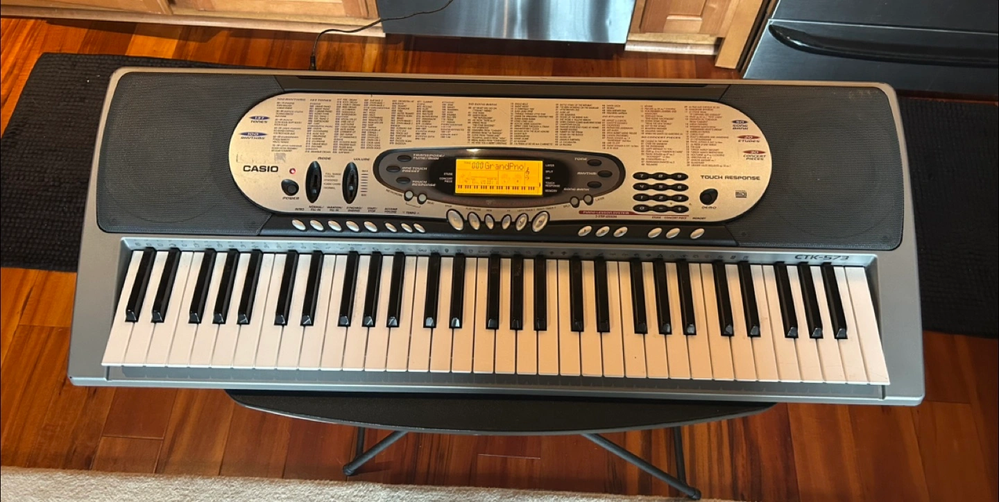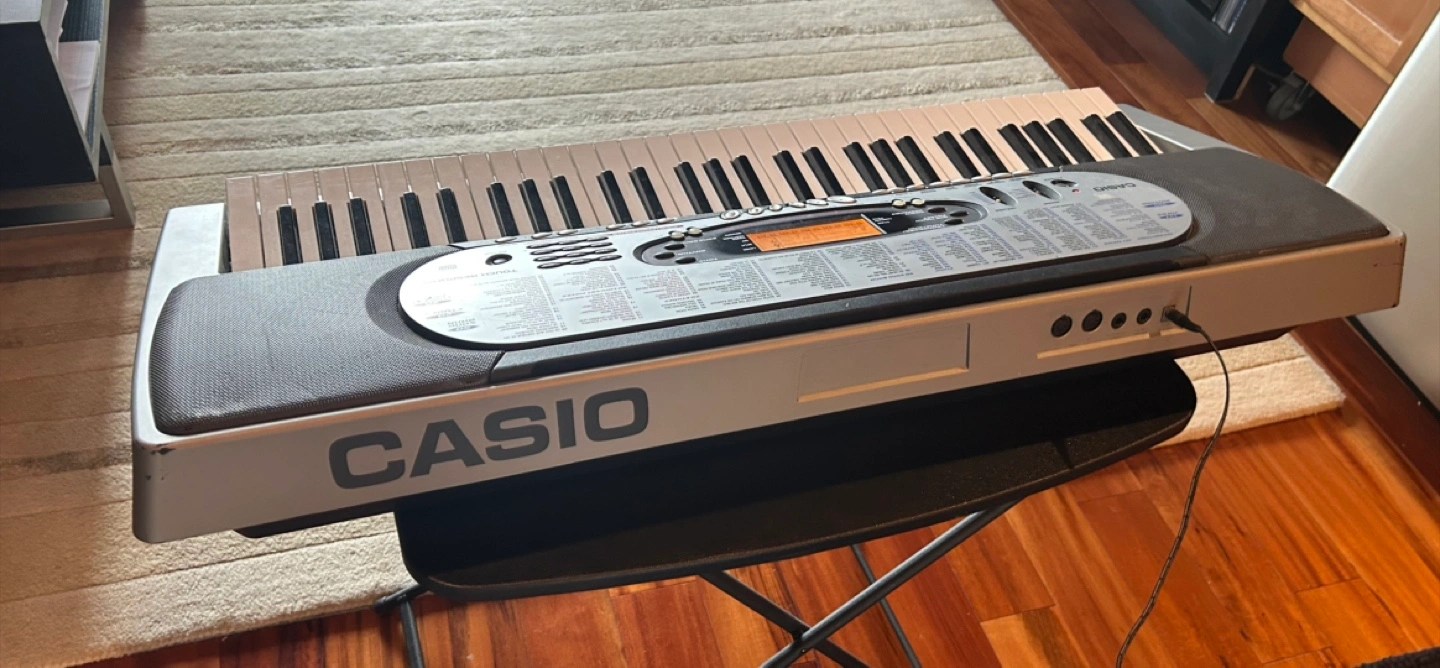 161Keyboard with 61 full size keys. Includes a screen and many function buttons. Built in sounds and songs. Features speakers. A perfect instrument to play and relax at the end of the day. Ac adapter included can run on D batteries. Very clean and sounds great! MIDI input/output.