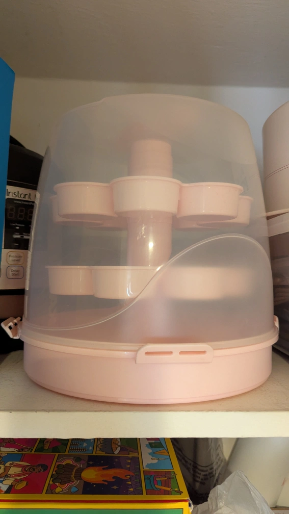 A plastic cupcake carrier - holds 12, similar one is on Amazon for ~$33