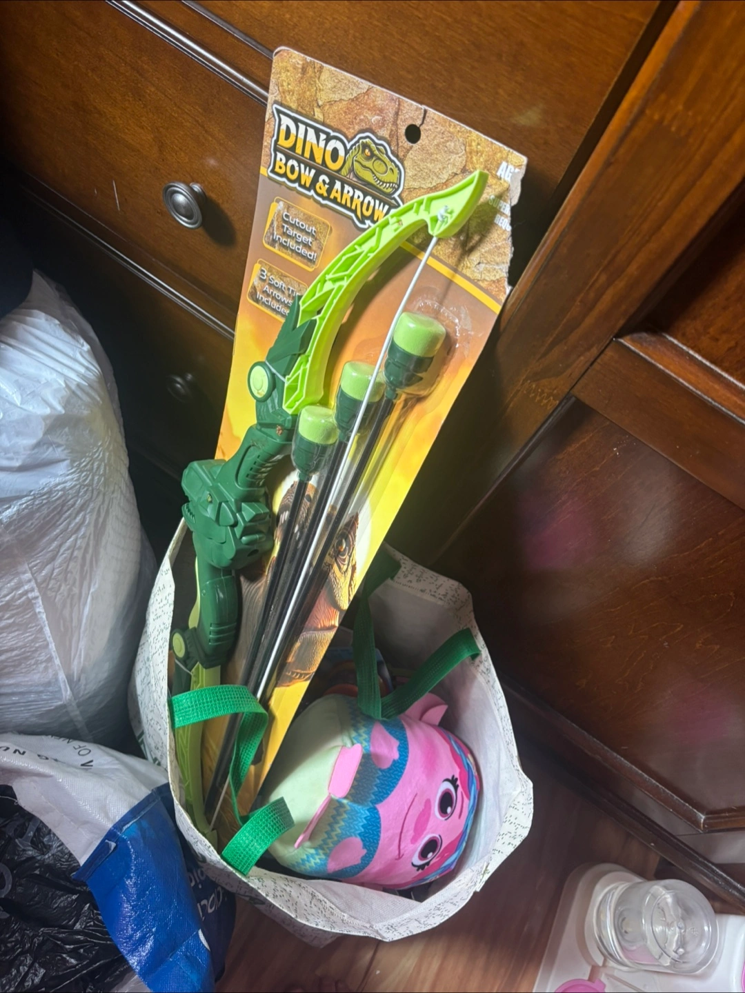Dino bow and arrow set, comes with arrows. Also includes some other assorted toys. This toy can provide hours of fun for the little ones. BAG FULL OF KIDS TOYS 20 DOLLAR PICK UP