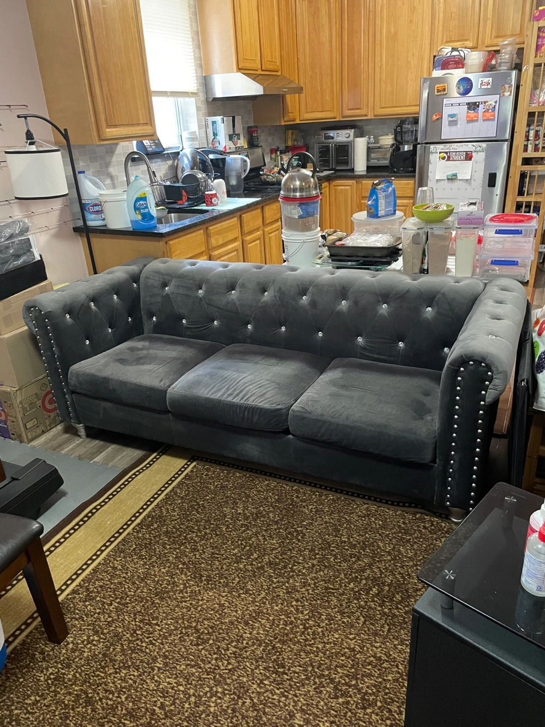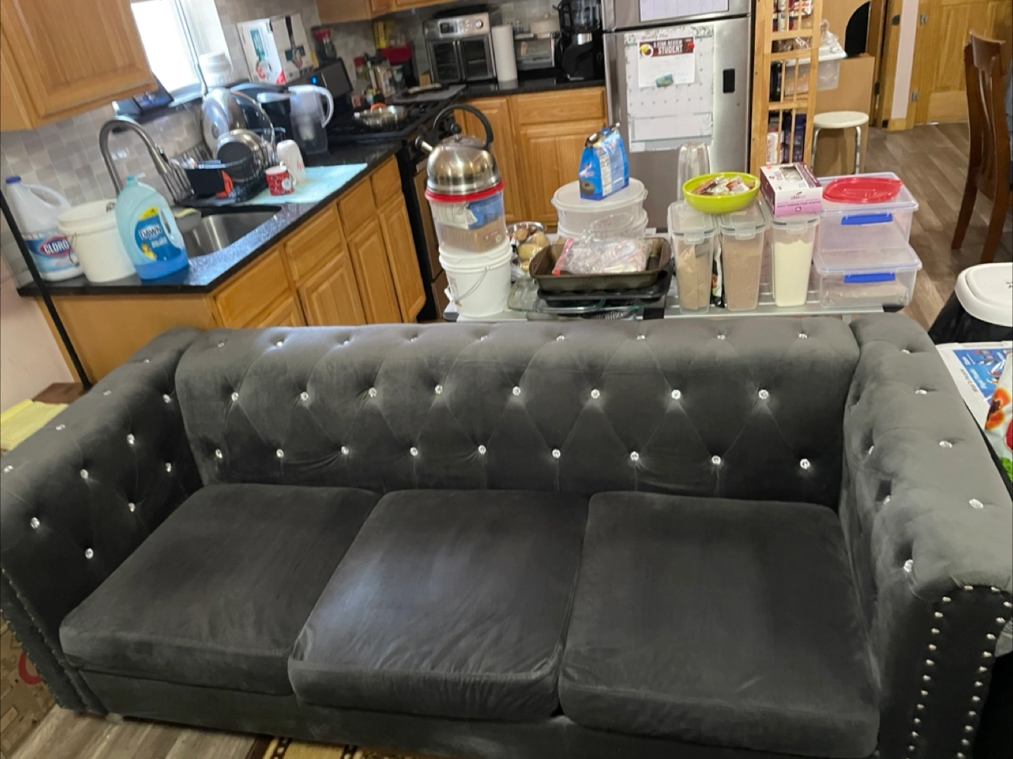 75Three-cushion sofa, upholstered in gray fabric. Features button-tufting and studded trim. A sofa like this would be ideal for an afternoon of reading. It was purchased from Raymour & Flannigan 6 months ago for $999. Has had a cover on it since purchased. Pickup only in Queens