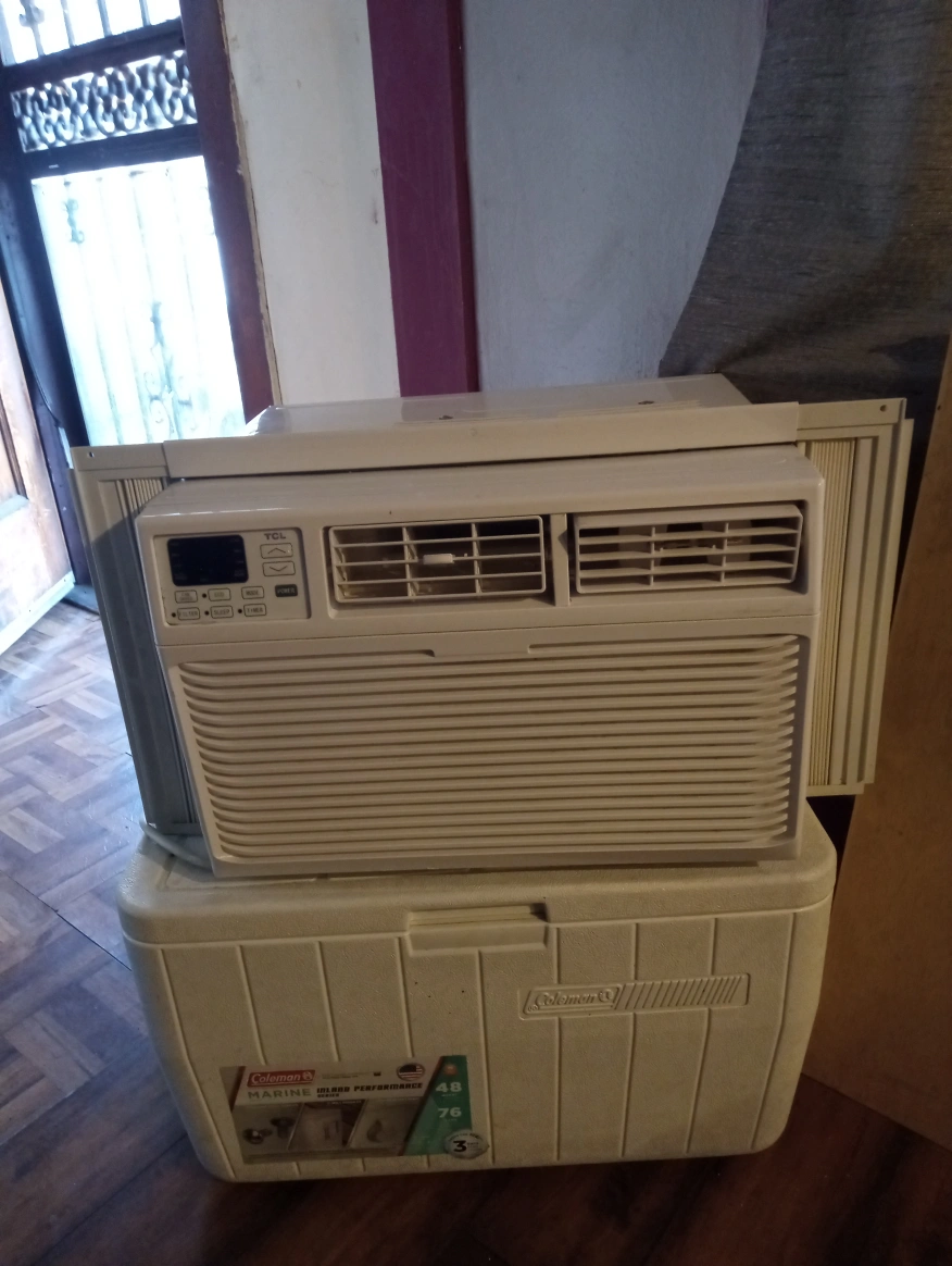 79A/C unit, likely for a window. Window panels are visible on the sides. Digital display with multiple button functions. Perfect for creating a cozy atmosphere in a room.