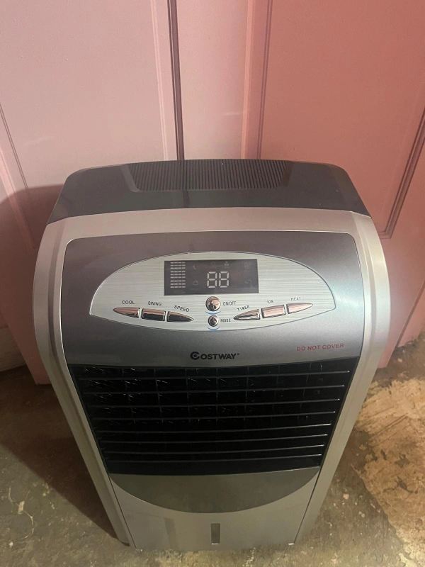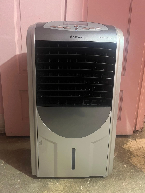 An air cooler, tall in design, with a silver and black color scheme. The top features several buttons and a digital display. You could use this to create a peaceful ambiance within your home.