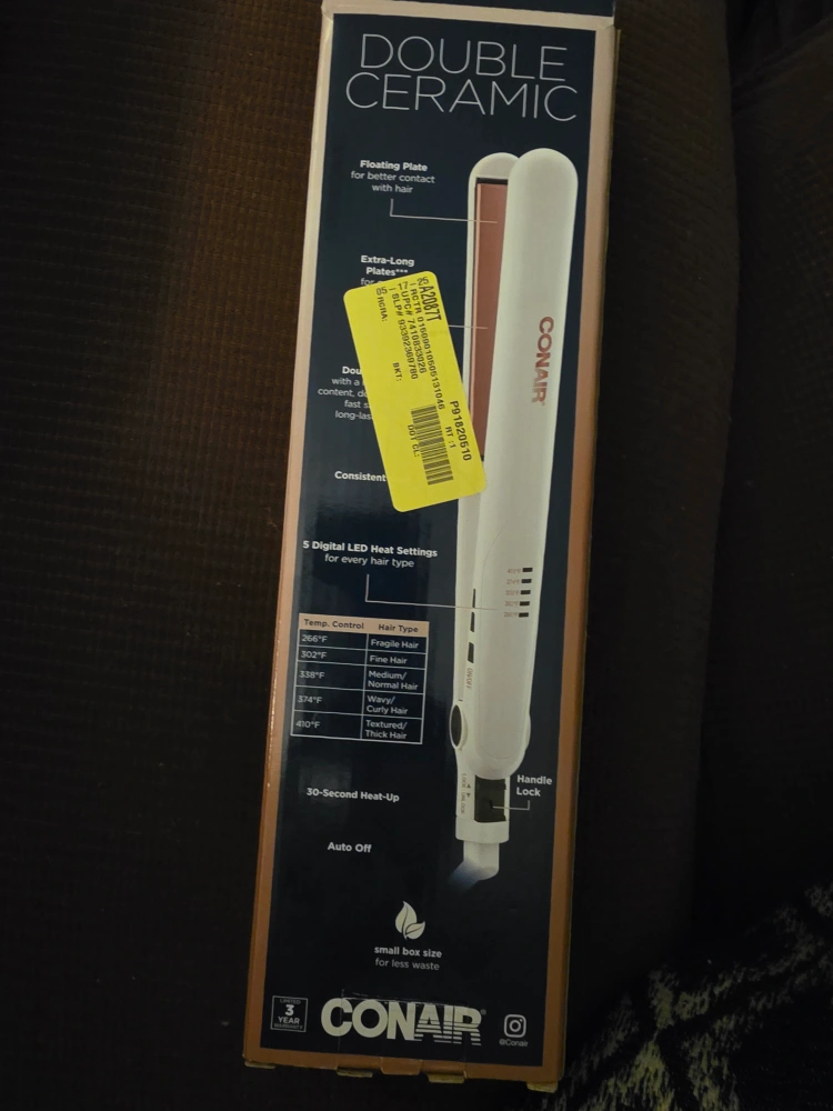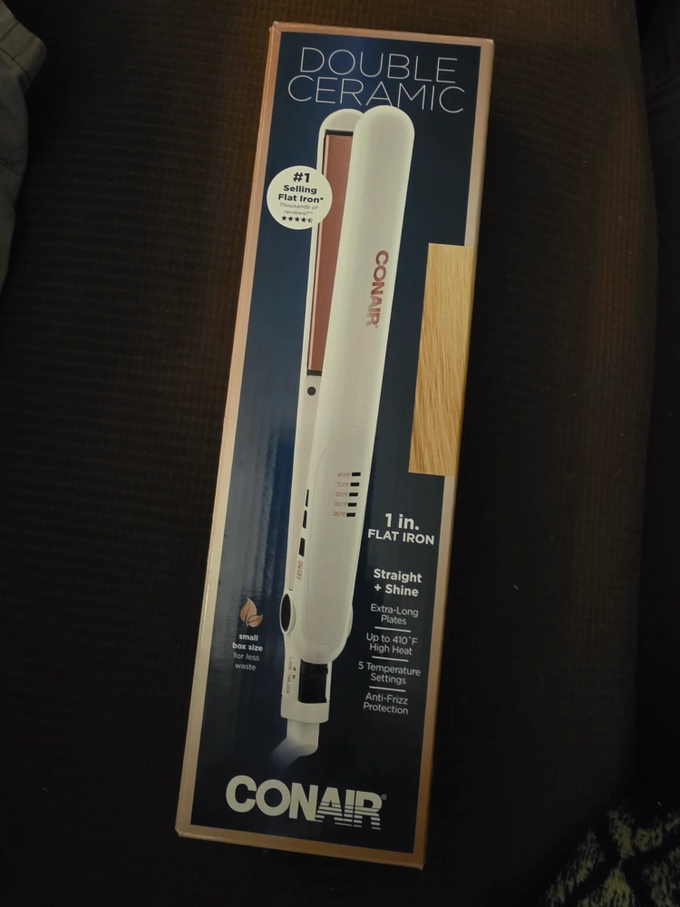 A new, unused Conair flat iron in its original packaging. Features include a floating plate, extra long plates, and a handle lock. Use it to effortlessly style your hair for a relaxing morning.