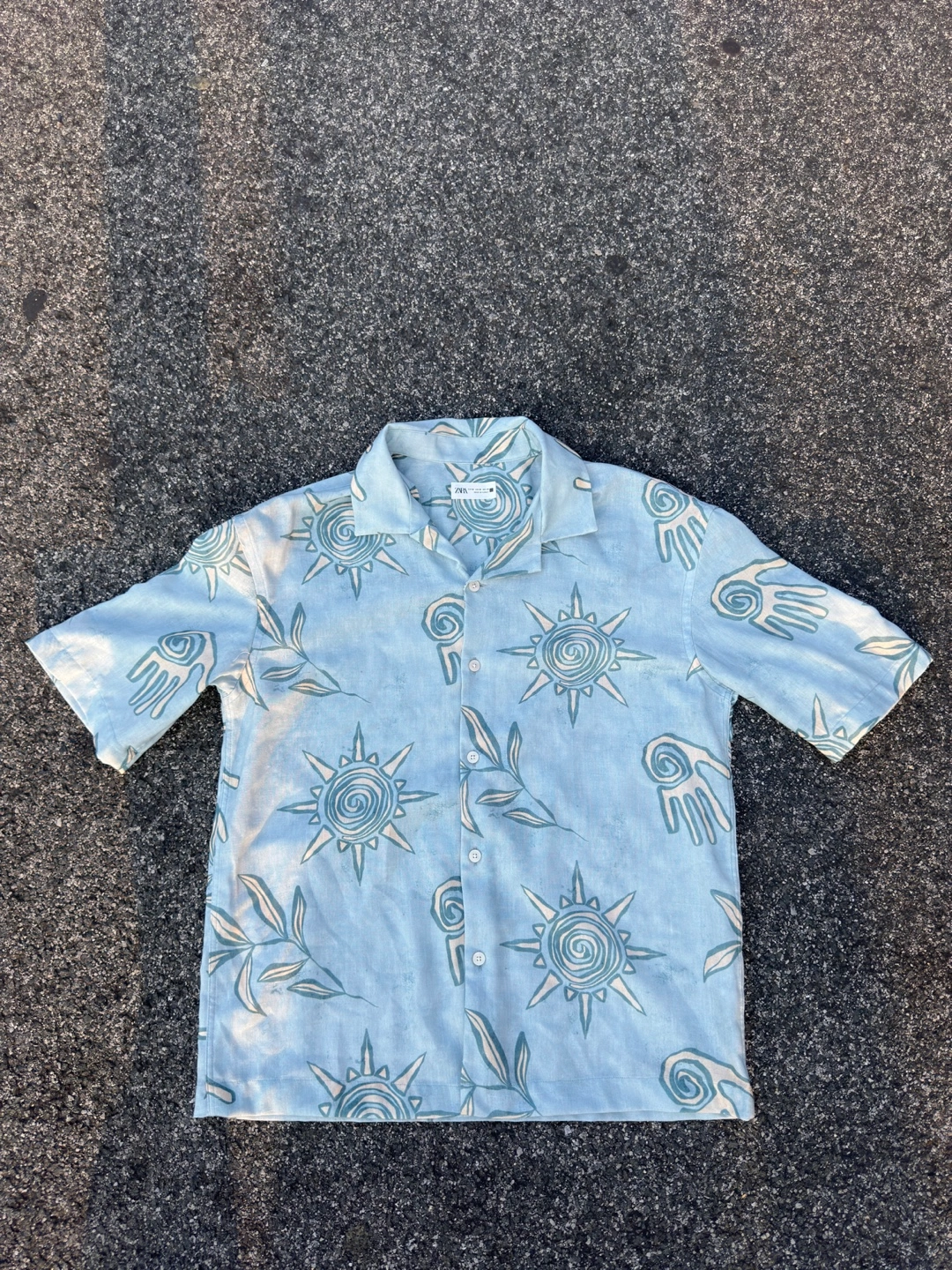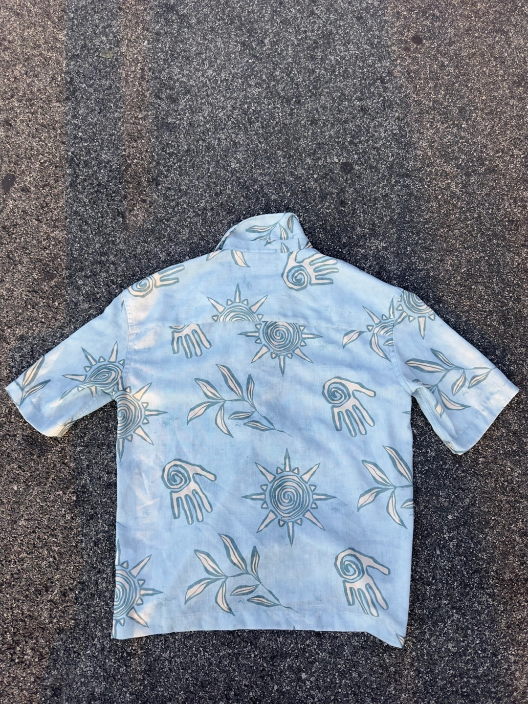 411Light blue, button-up shirt. Features short sleeves, a collared neckline, and an allover print. A great choice for a relaxing evening.