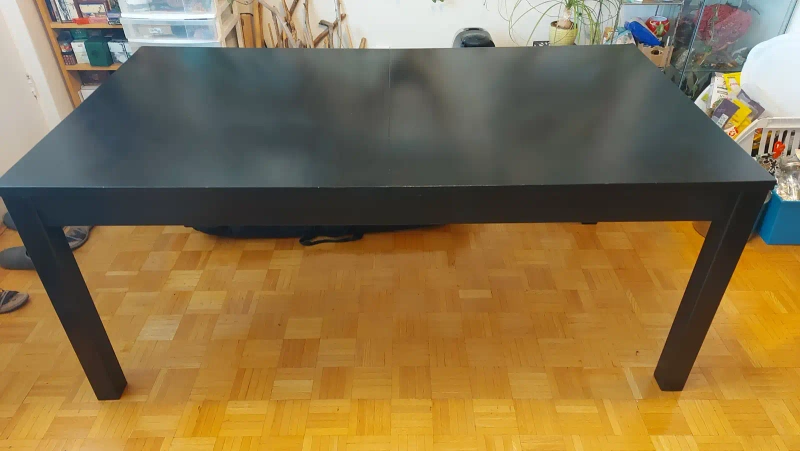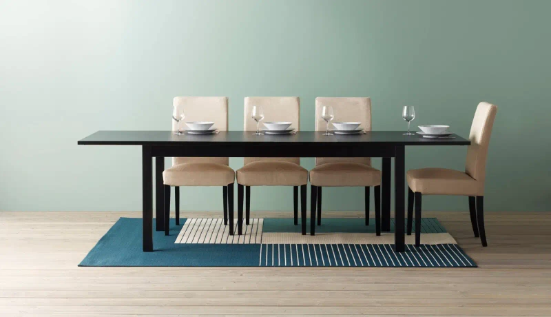 Description : Table top/ Extension leaf/ Leg: Particleboard, Ash veneer, Stain, Clear acrylic lacquer Underframe: Solid pine, Ash veneer, Stain, Clear acrylic lacquer Rail/ Extension rail: Solid wood (stained black)