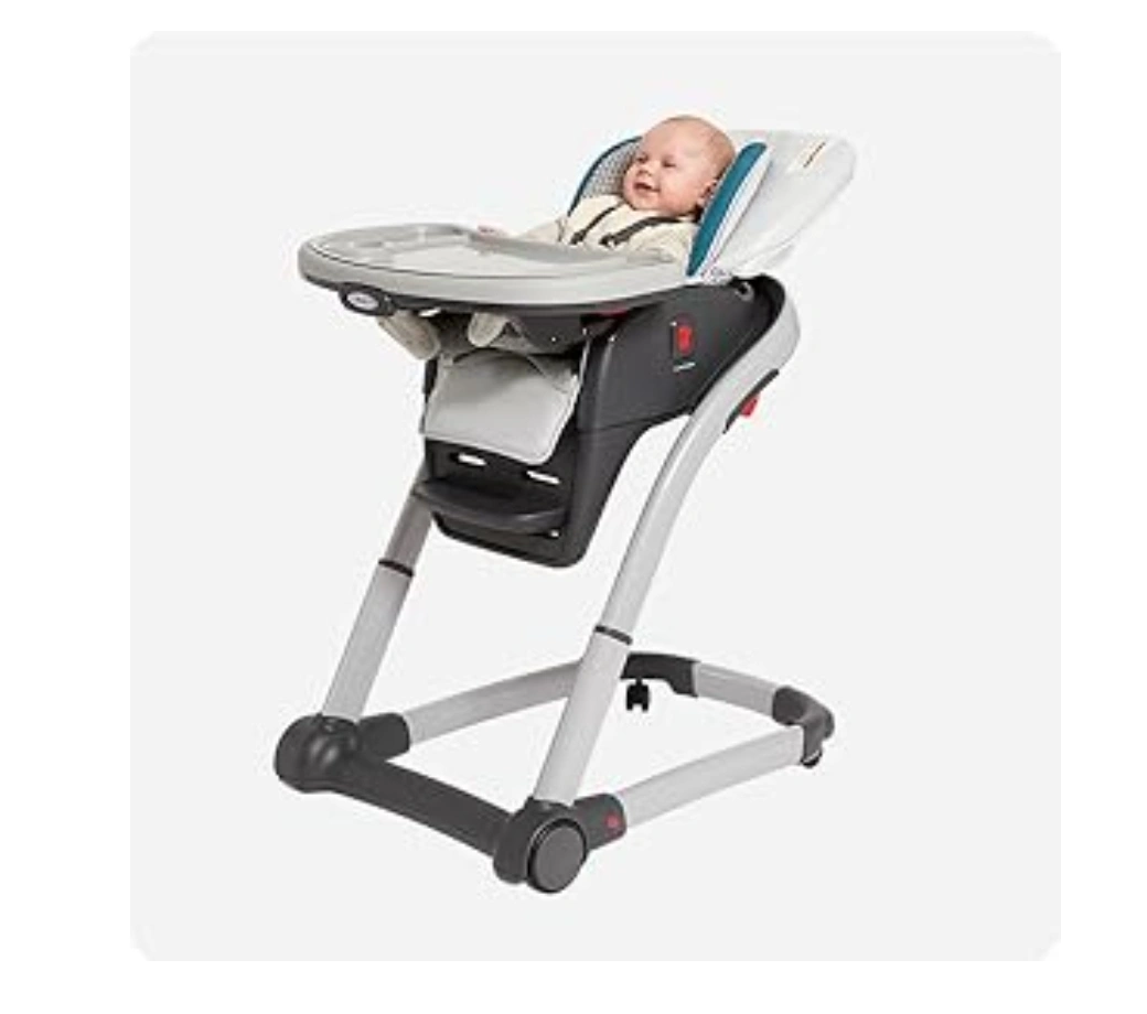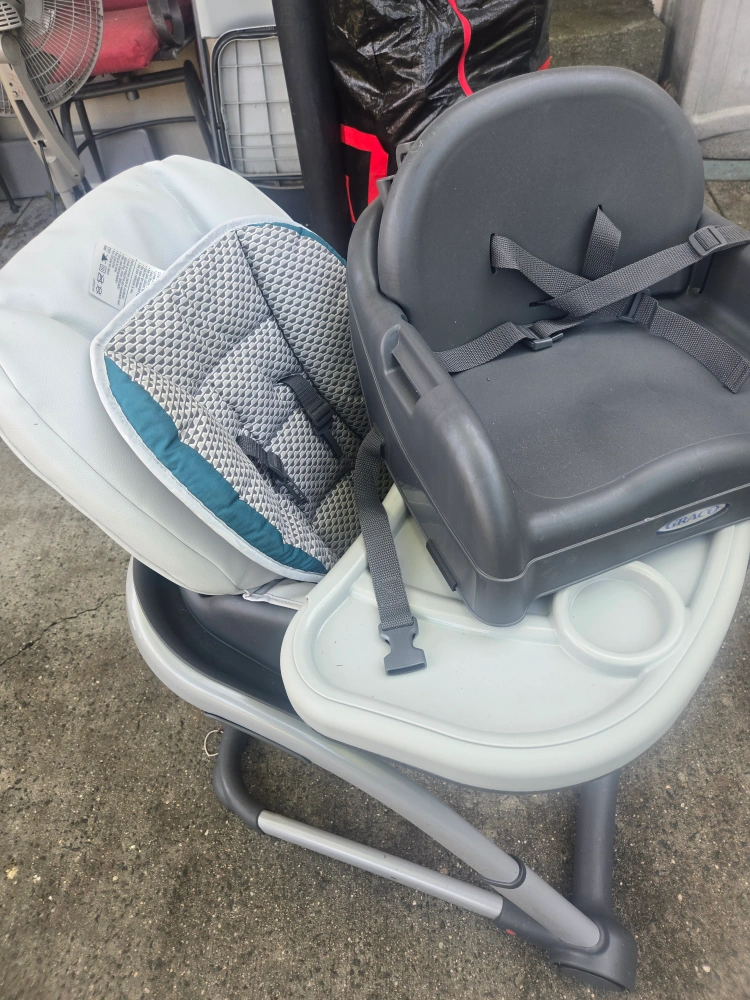 High chair with various components. Comes with a tray, infant body support, and adjustable footrest. A great tool for helping your child enjoy their meals and have fun. rear Wheels were misplaced..so no Wheels but work fine as is.