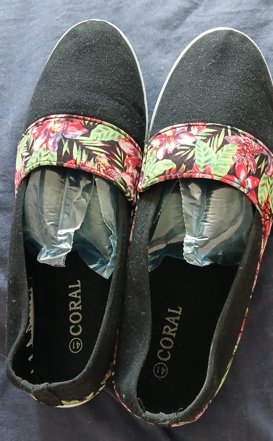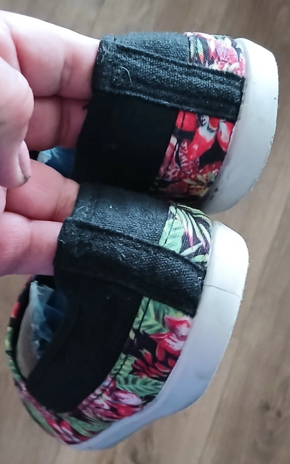 381Black slip-on shoes. Floral print detailing along the top. White sole,bought in Puerto Rico used 2 times.