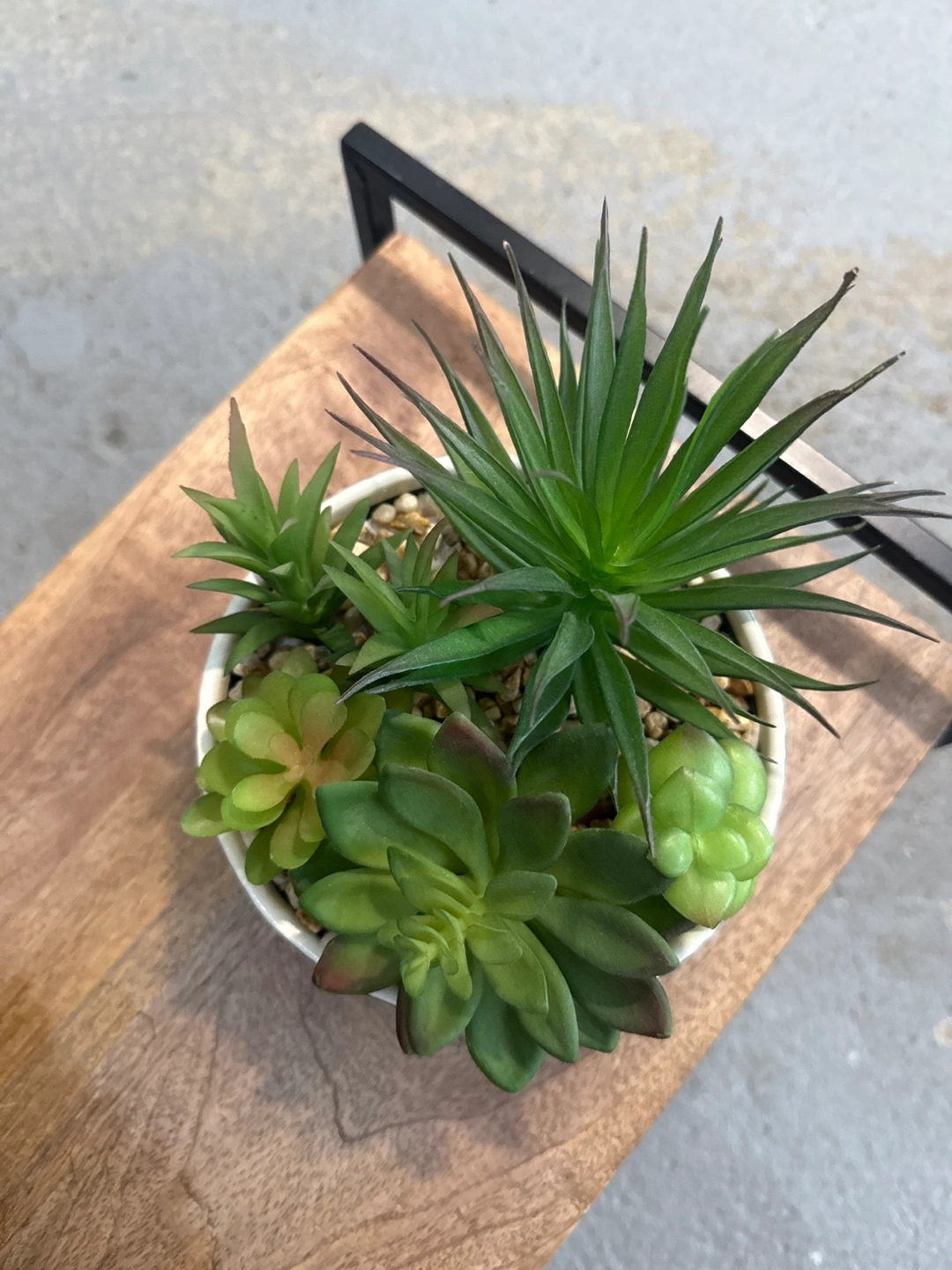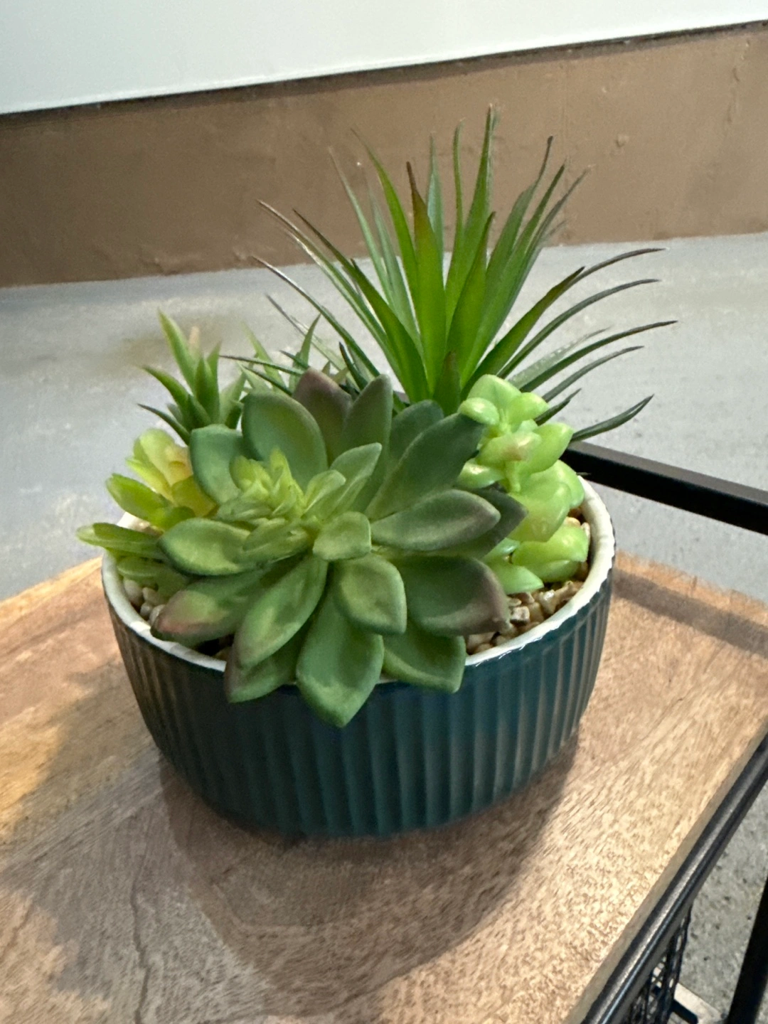 A charming little arrangement. Features a dark green pot and several faux succulents and greenery. Can be placed anywhere for an instant touch of nature, with no maintenance needed. This would be a lovely addition to your home.
