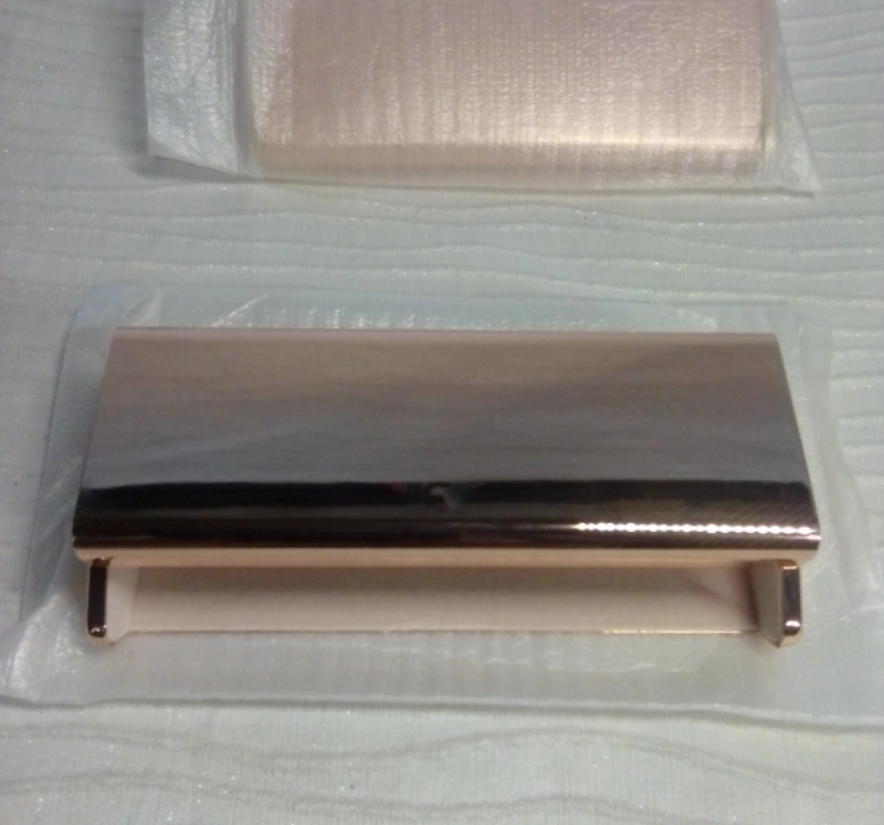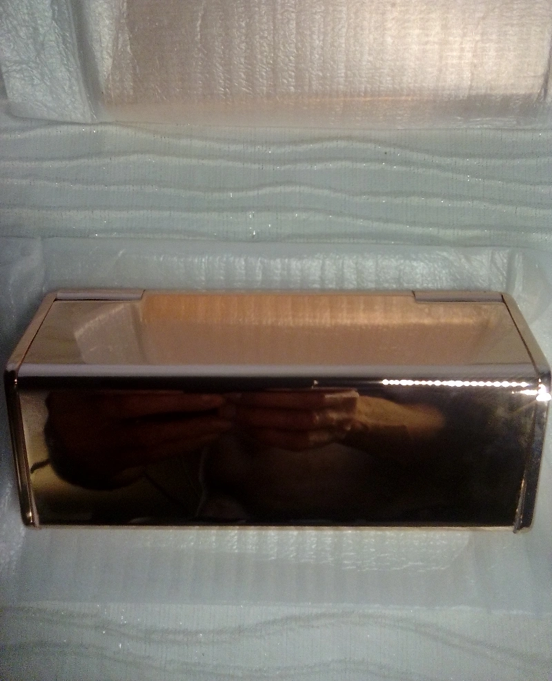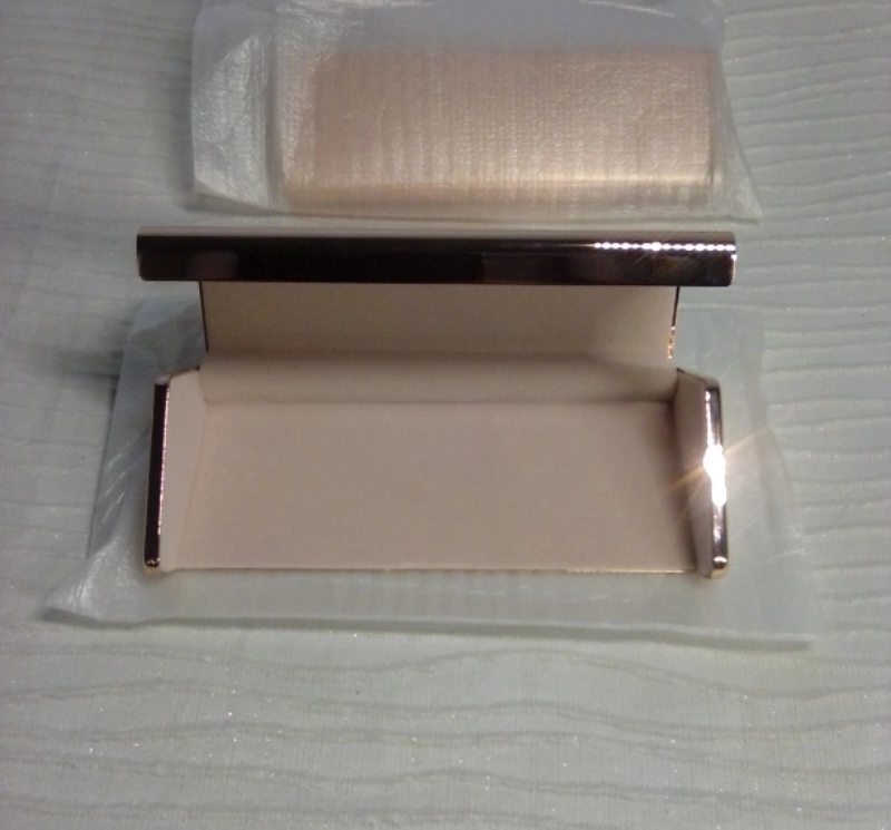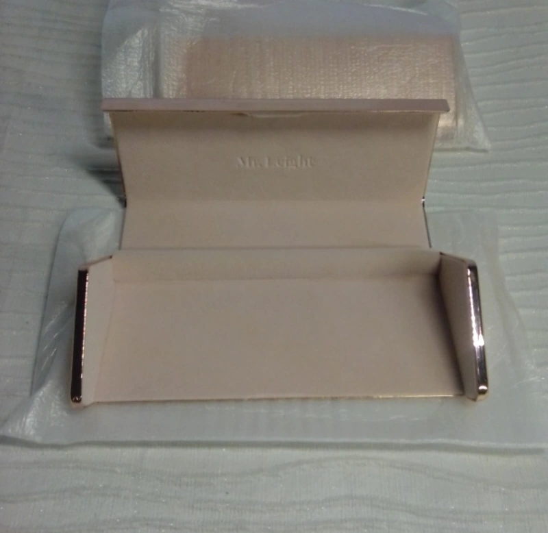 A rose gold colored eyeglass case. Featuring a hinged lid. Perfect for storing your glasses, so you can keep them safe.