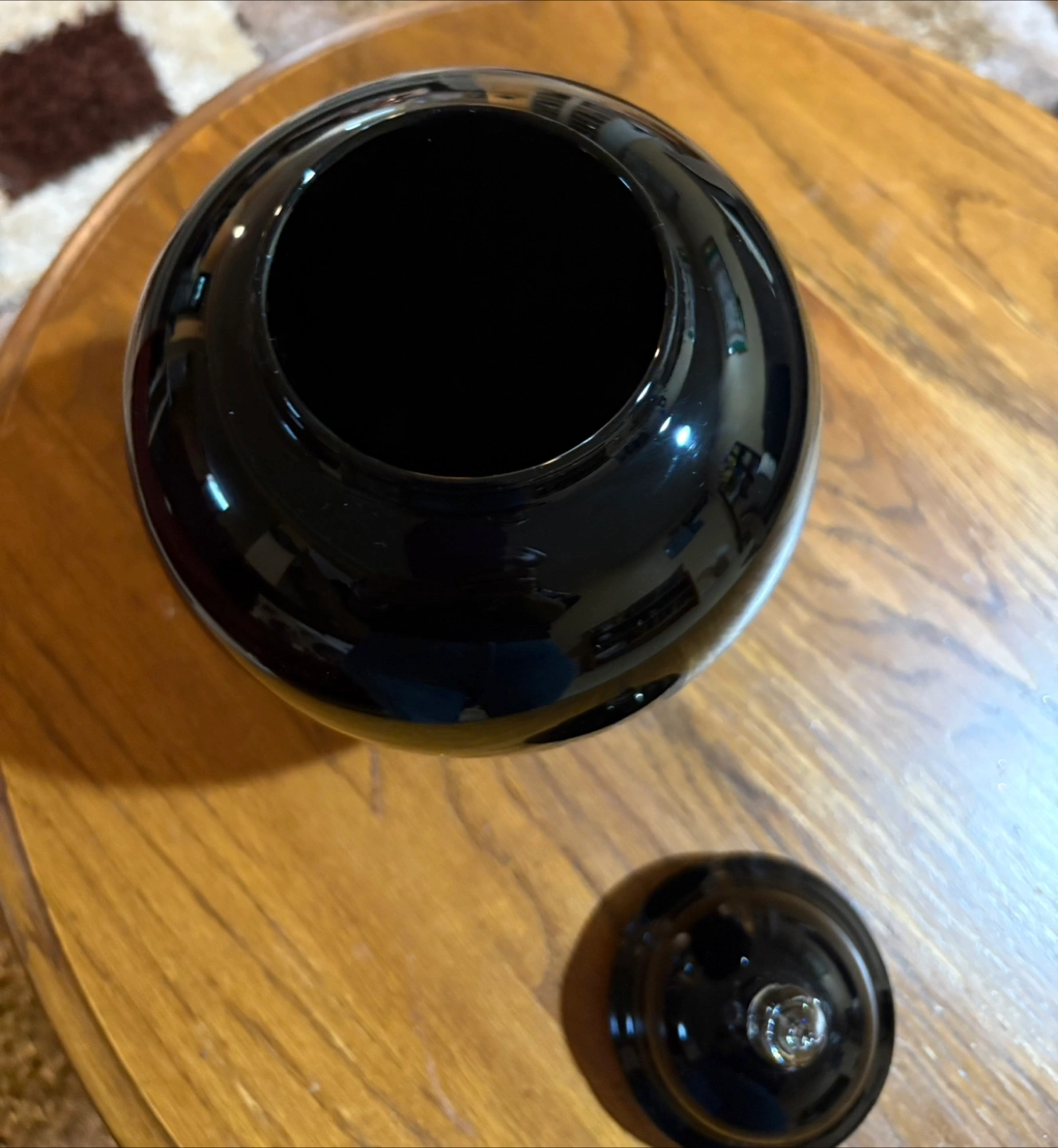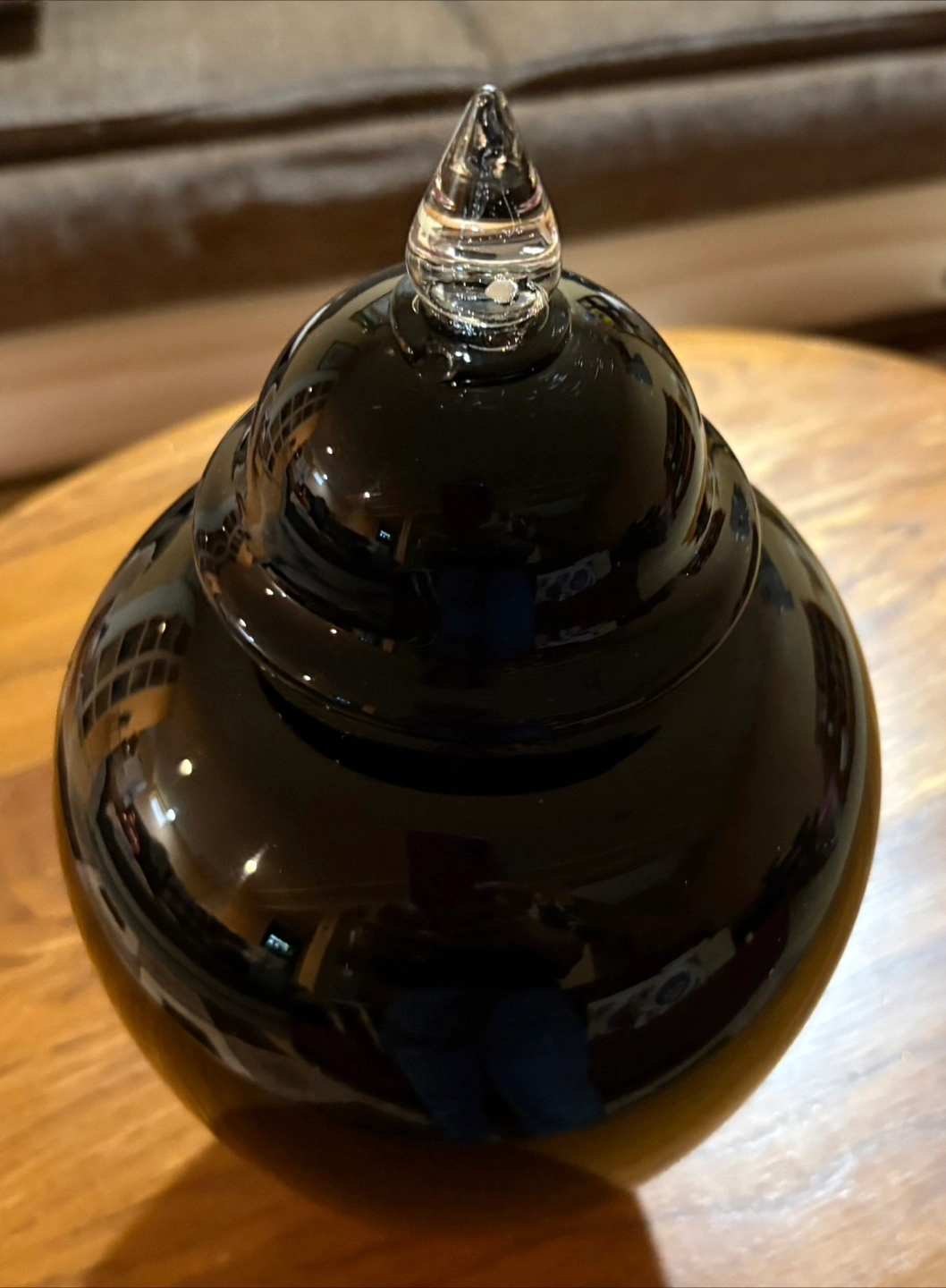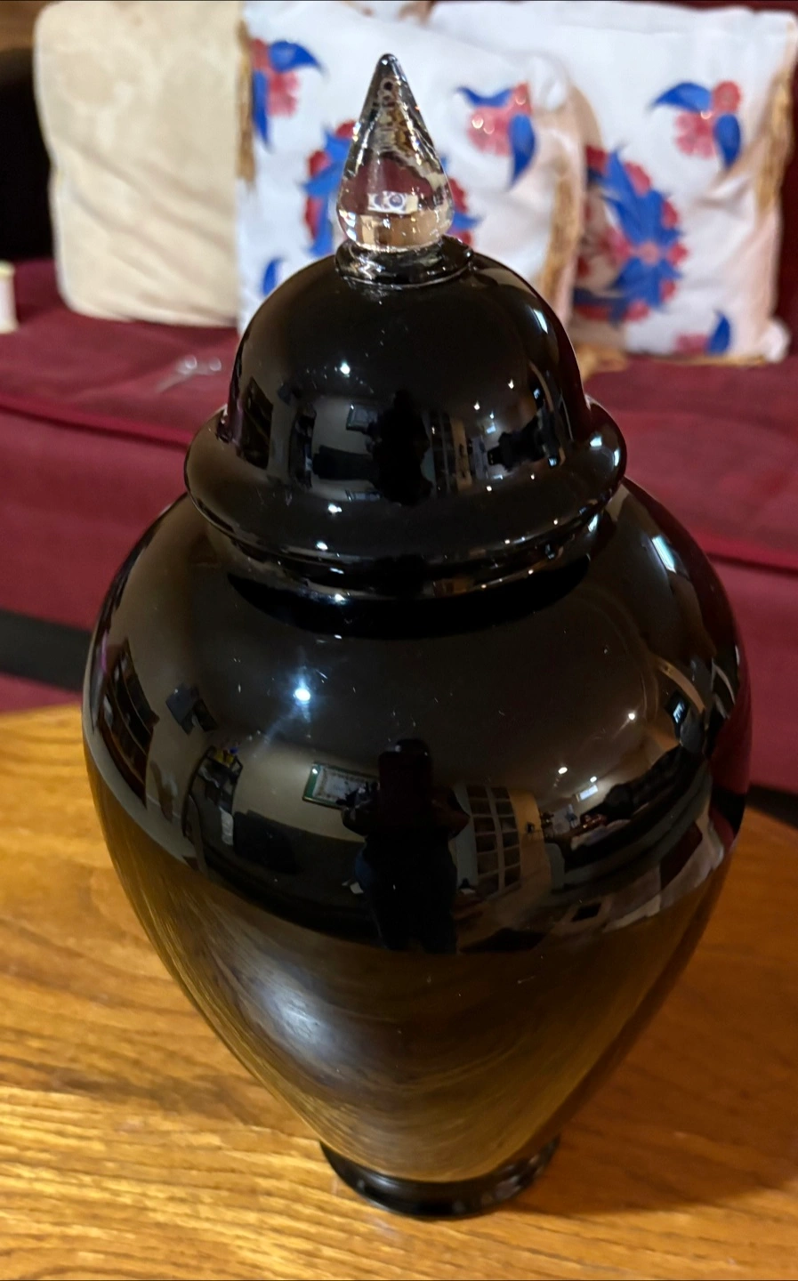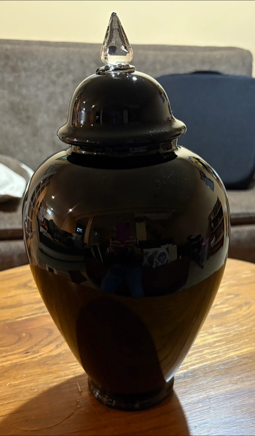 Dark glass vase. Features a lid with a clear glass finial. The vase is round and has a wide base. Add it to a mantle for a lovely decorative piece.