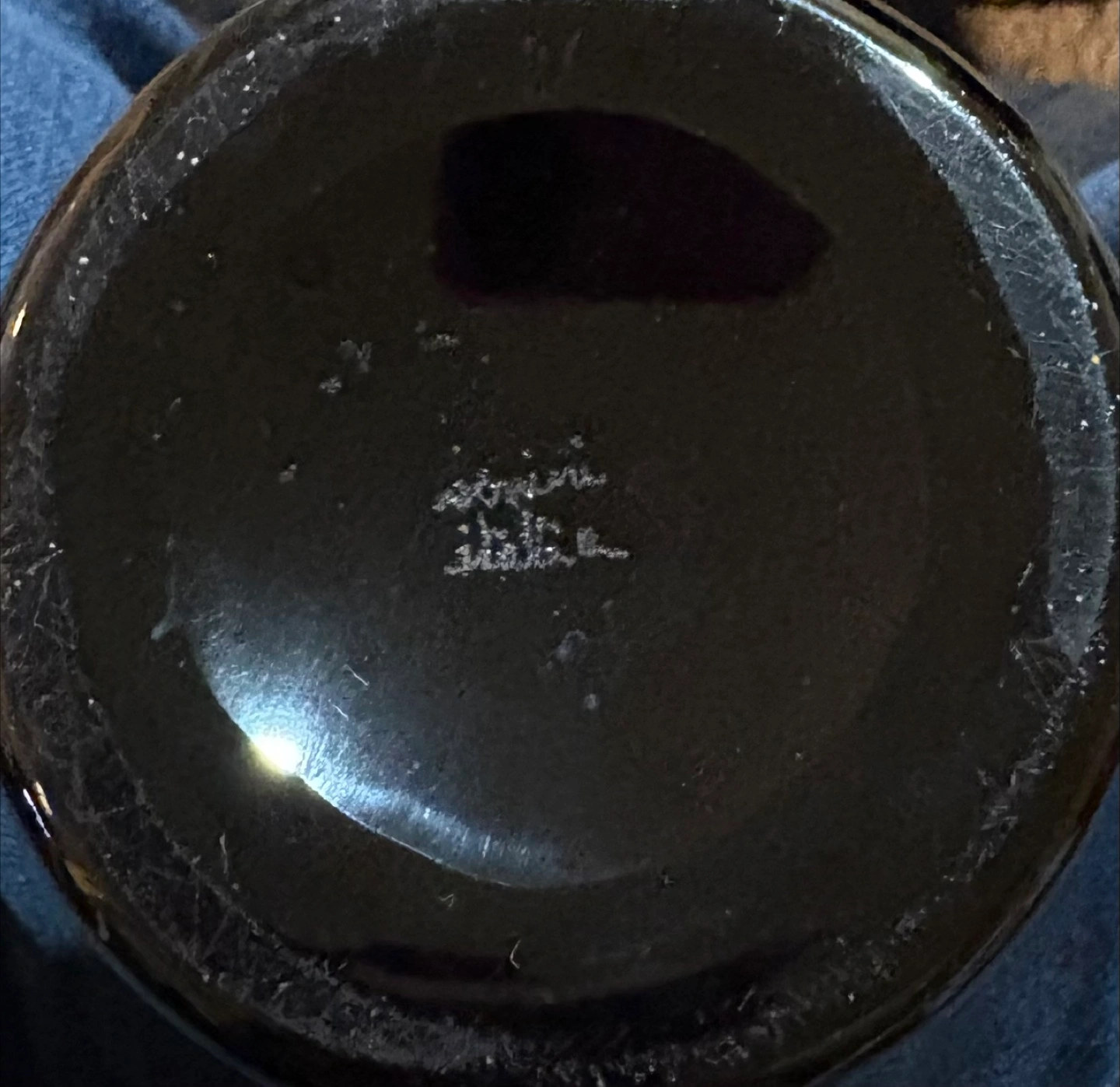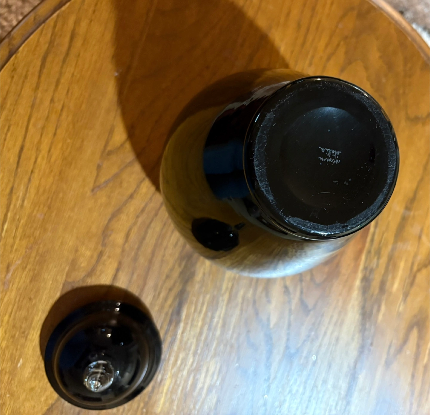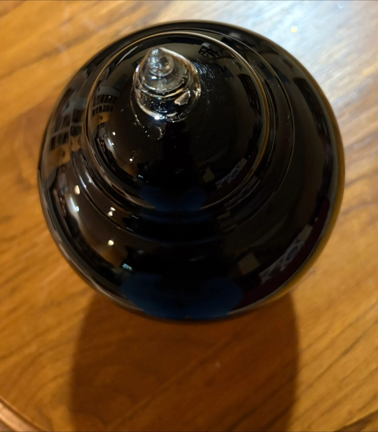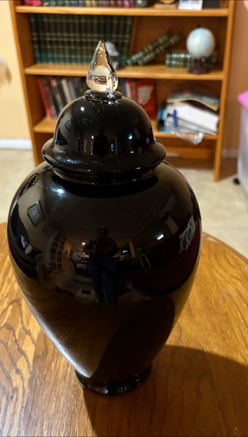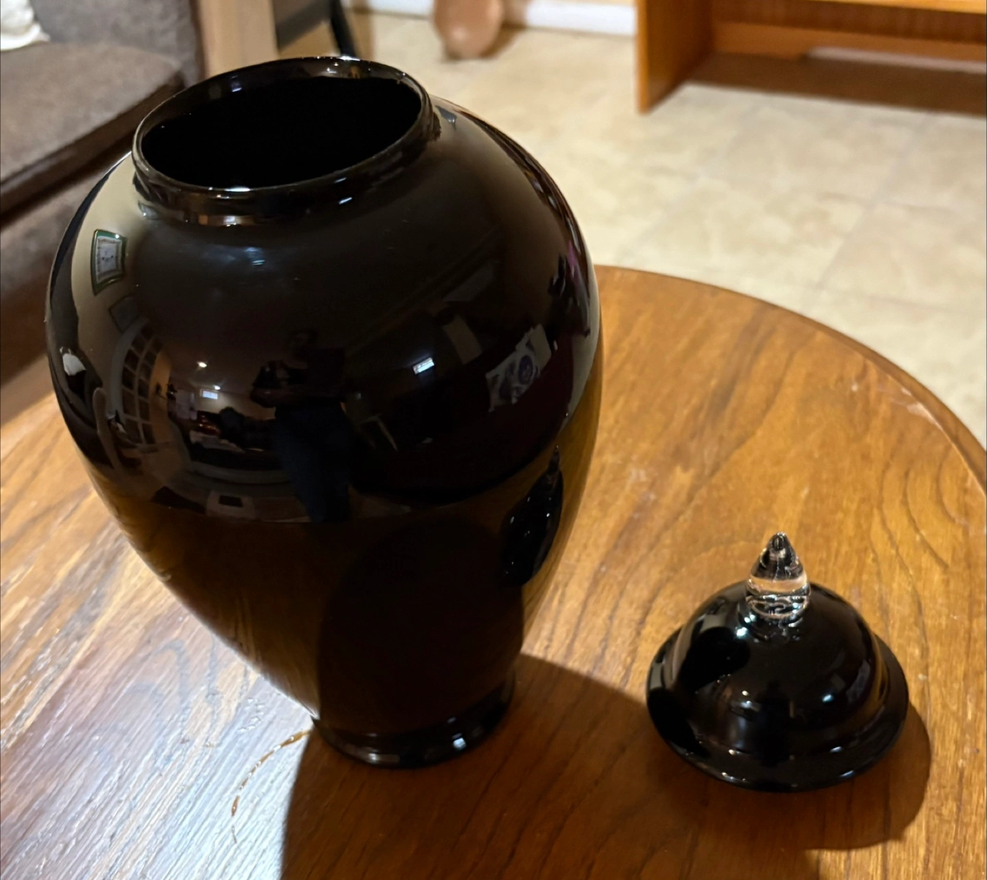 Dark glass vase. Features a lid with a clear glass finial. The vase is round and has a wide base. Add it to a mantle for a lovely decorative piece.