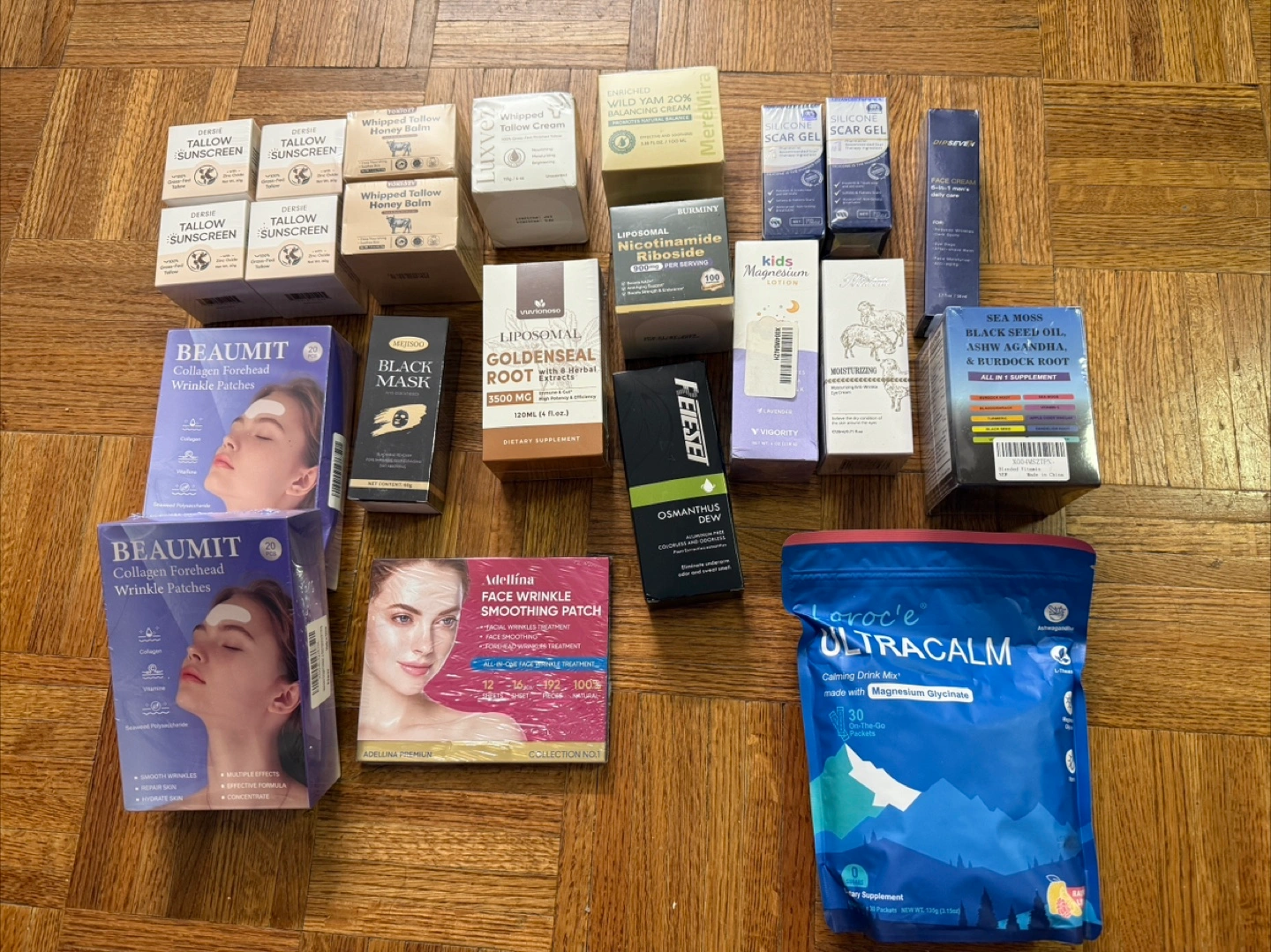 Assortment of skincare and health items, including supplements, face masks, and creams. These items can be used for various purposes to help achieve a sense of tranquility.