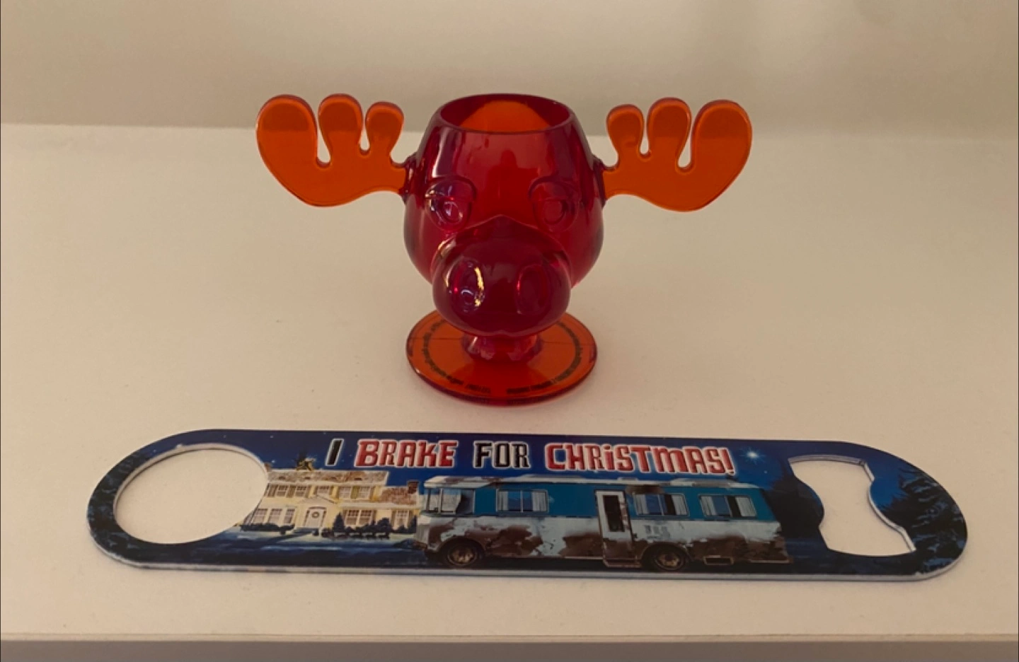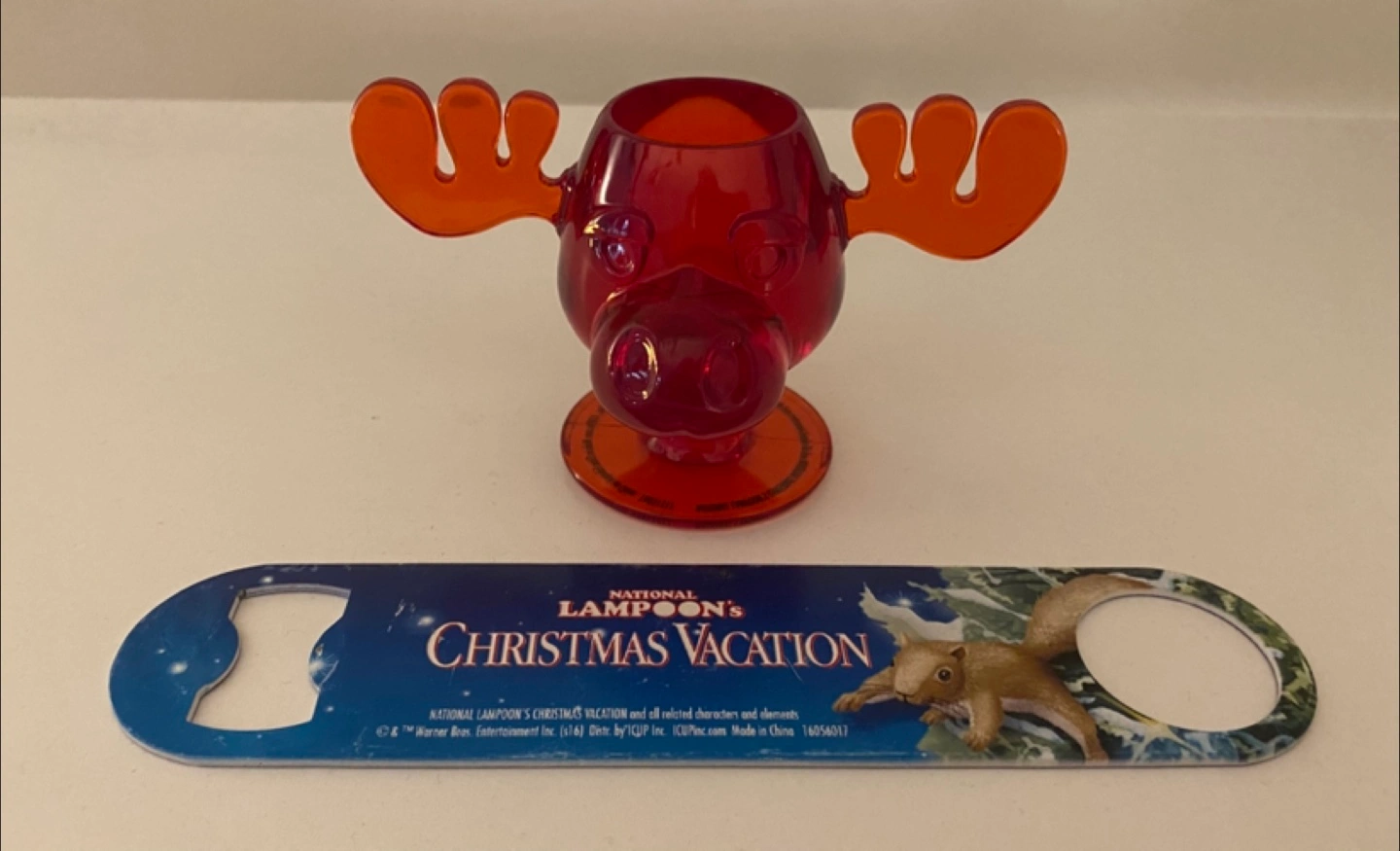 A novelty set featuring a moose-shaped plastic shot glass and metal bottle opener. Used but still in good shape - add something to your bar! Pick up is in midtown near the Empire State building .