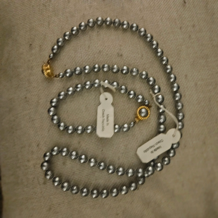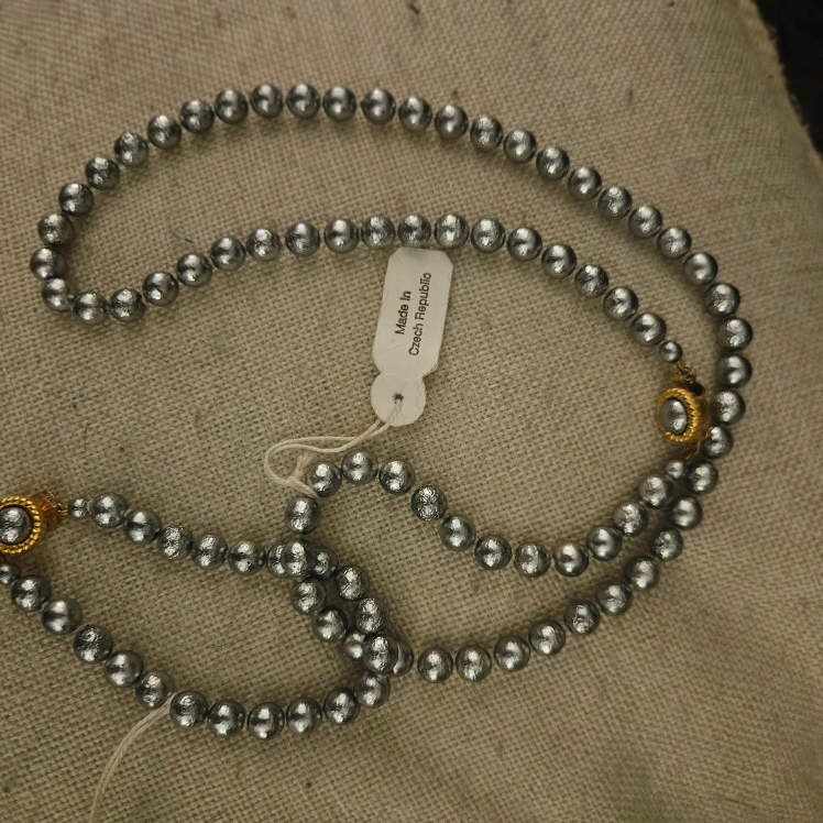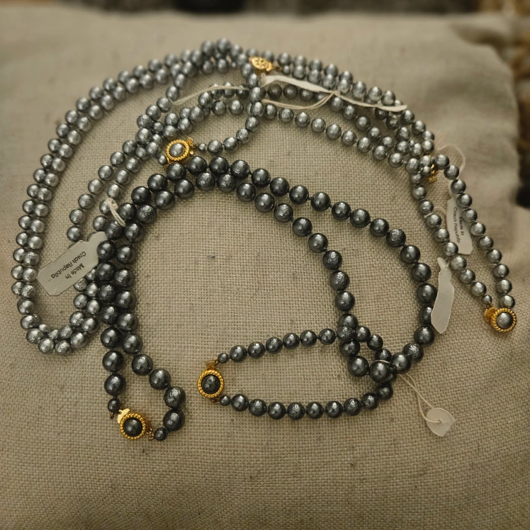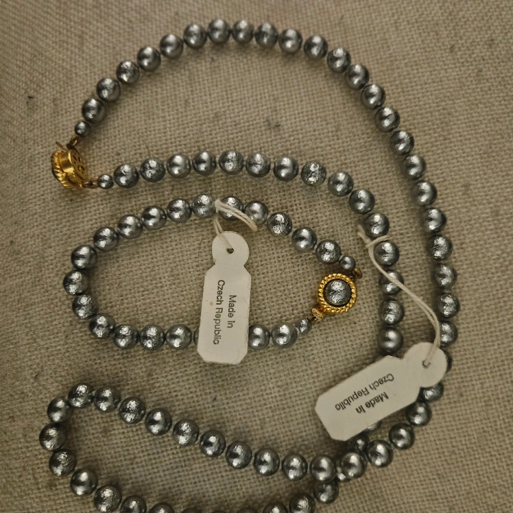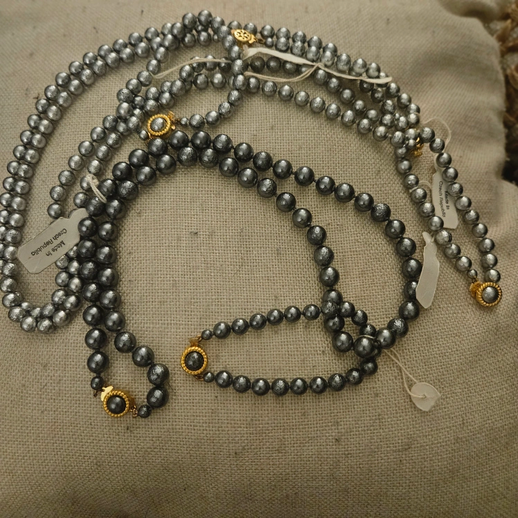 Several beaded necklaces and a matching bracelet. Metallic gray in color. Round beads. Gold-colored clasps. Imagine how relaxed you would feel while wearing these elegant pieces.Made in Czech Republic,prices for each set