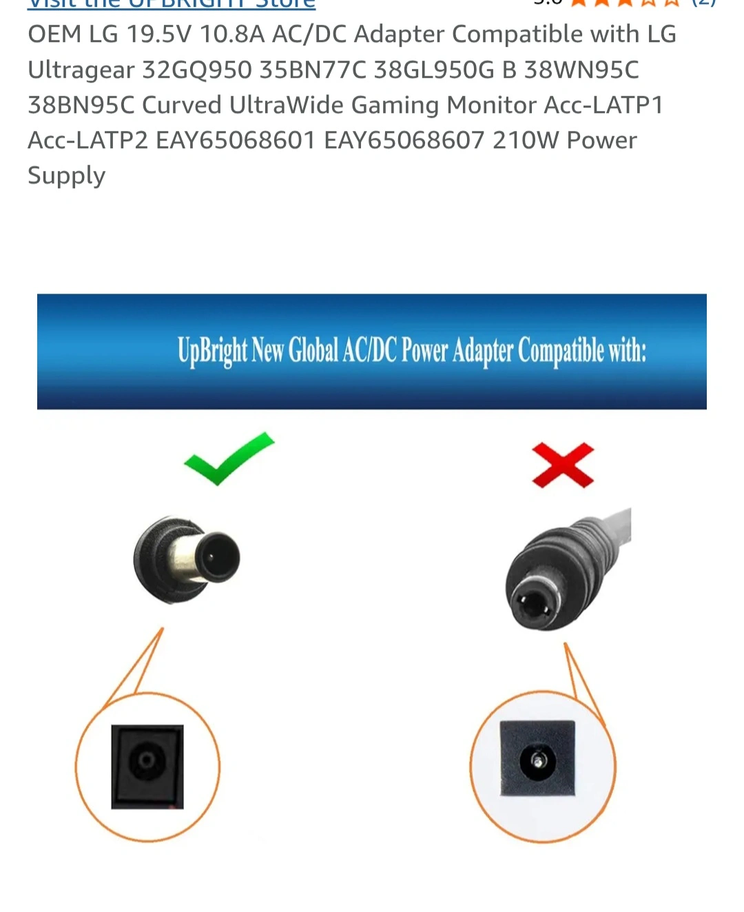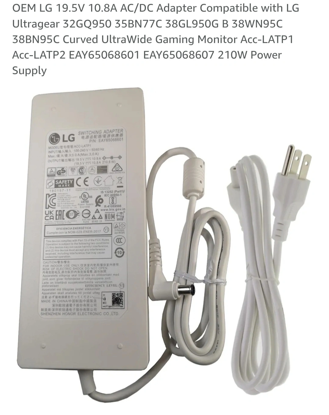 OEM LG 19.5V 10.8A AC/DC Adapter Compatible with LG Ultragear 32GQ950 35BN77C 38GL950G B 38WN95C 38BN95C Curved UltraWide Gaming Monitor Acc-LATP1 Acc-LATP2 EAY65068601 EAY65068607 210W Power Supply